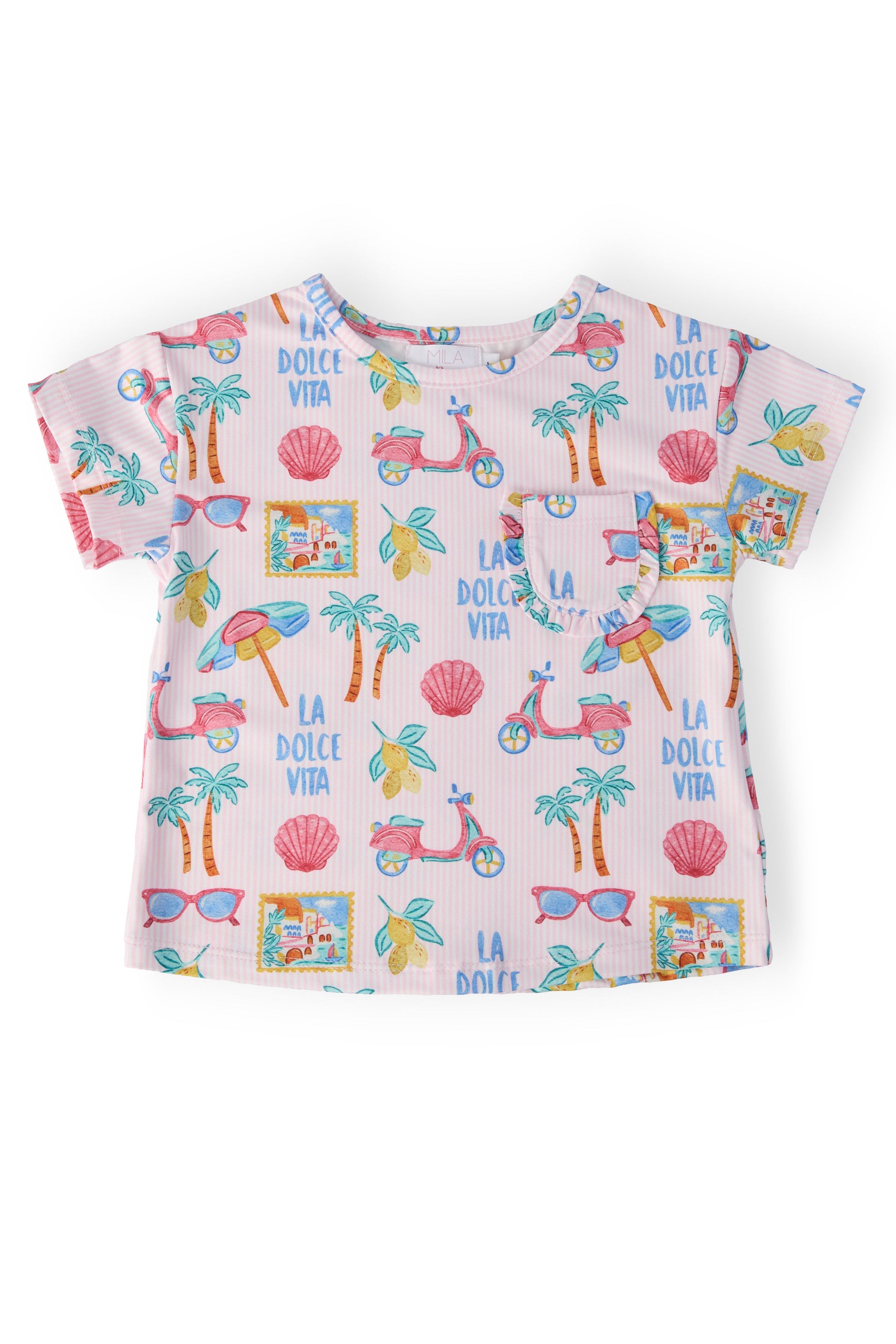 Our Ruffle Pocket Tee is the perfect trendy basic. Boxy fit pairs great with leggings or shorts. Slightly cropped, but still long enough to cover the tummy. Great for casual days at school or the playground. Mila loves wearing this tee for her hip hop classes because it is trendy but still girly.