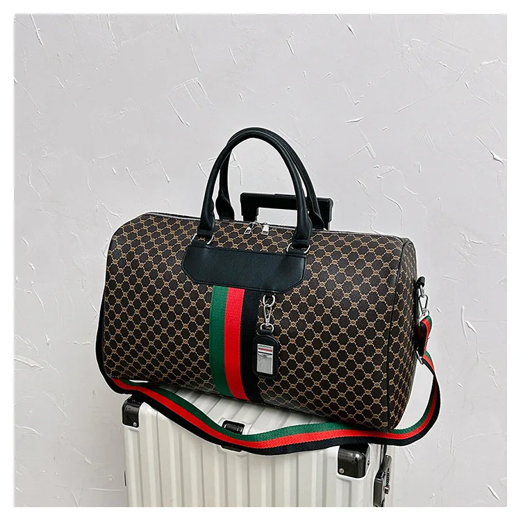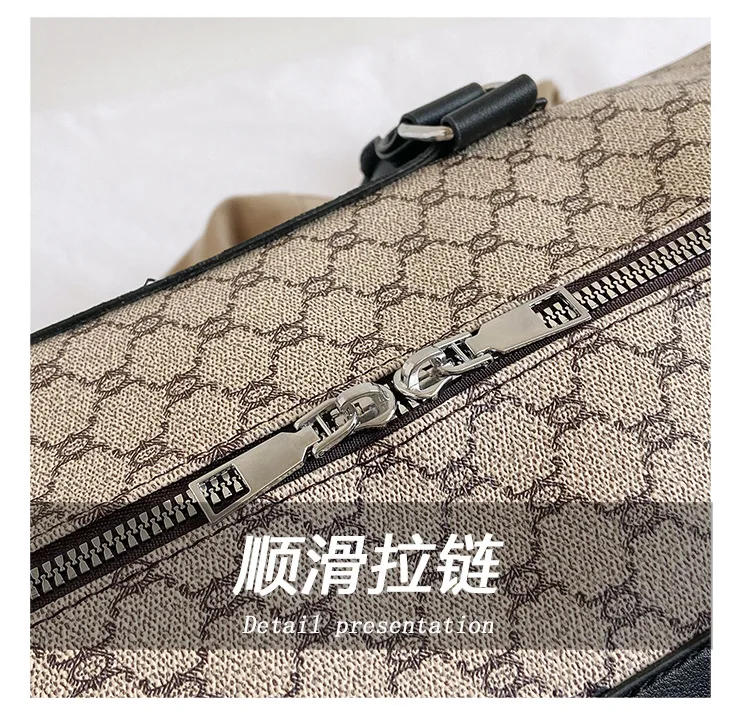 This luxury travel handbag offers a large capacity and durable design, crafted from PU with a synthetic leather lining. Featuring a secure zipper closure and a stylish striped pattern, it suits various occasions with its casual tote shape. This hard-structured bag is designed for both men and women, combining practicality with elegant simplicity.