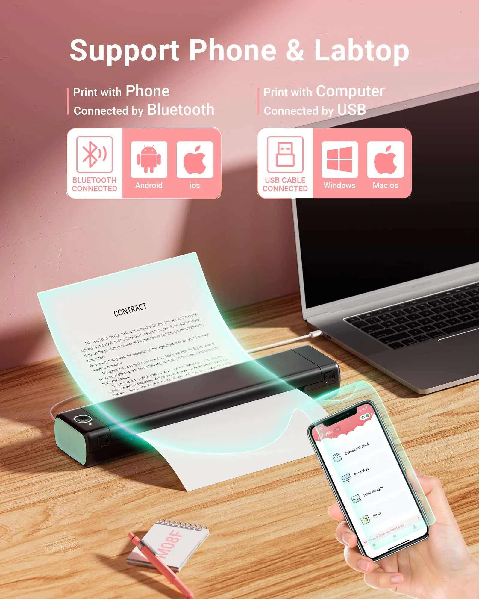 The M08F printer can be printed through your phone, Just install an APP and connect by Bluetooth, the files can be printed.