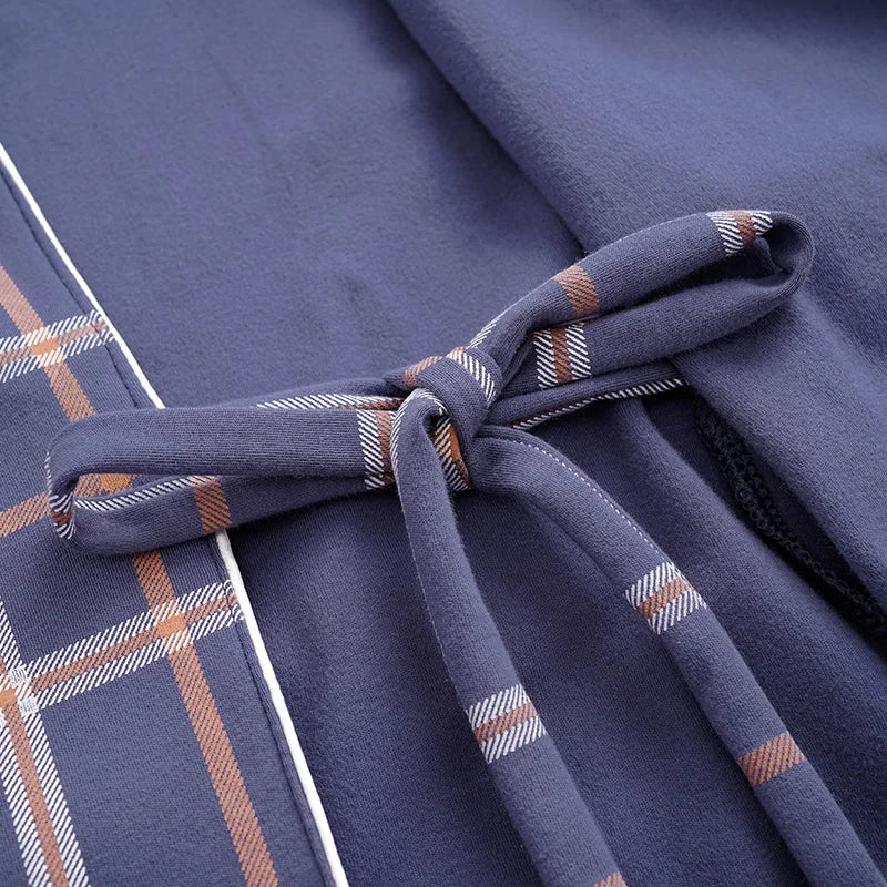 Elevate your loungewear collection with our premium Men's Cotton Kimono Bathrobe Set. Featuring a sophisticated V-neck design and classic plaid pattern, two-piece ensemble includes a long-sleeve robe and matching pants for complete comfort. Crafted from a luxurious cotton-polyester blend, the set offers the perfect balance of softness and durability. The convenient elastic waist and belt closure ensure a customized fit, while the knitted construction provides exceptional comfort for spring and autumn wear. Transform your relaxation experience with this essential