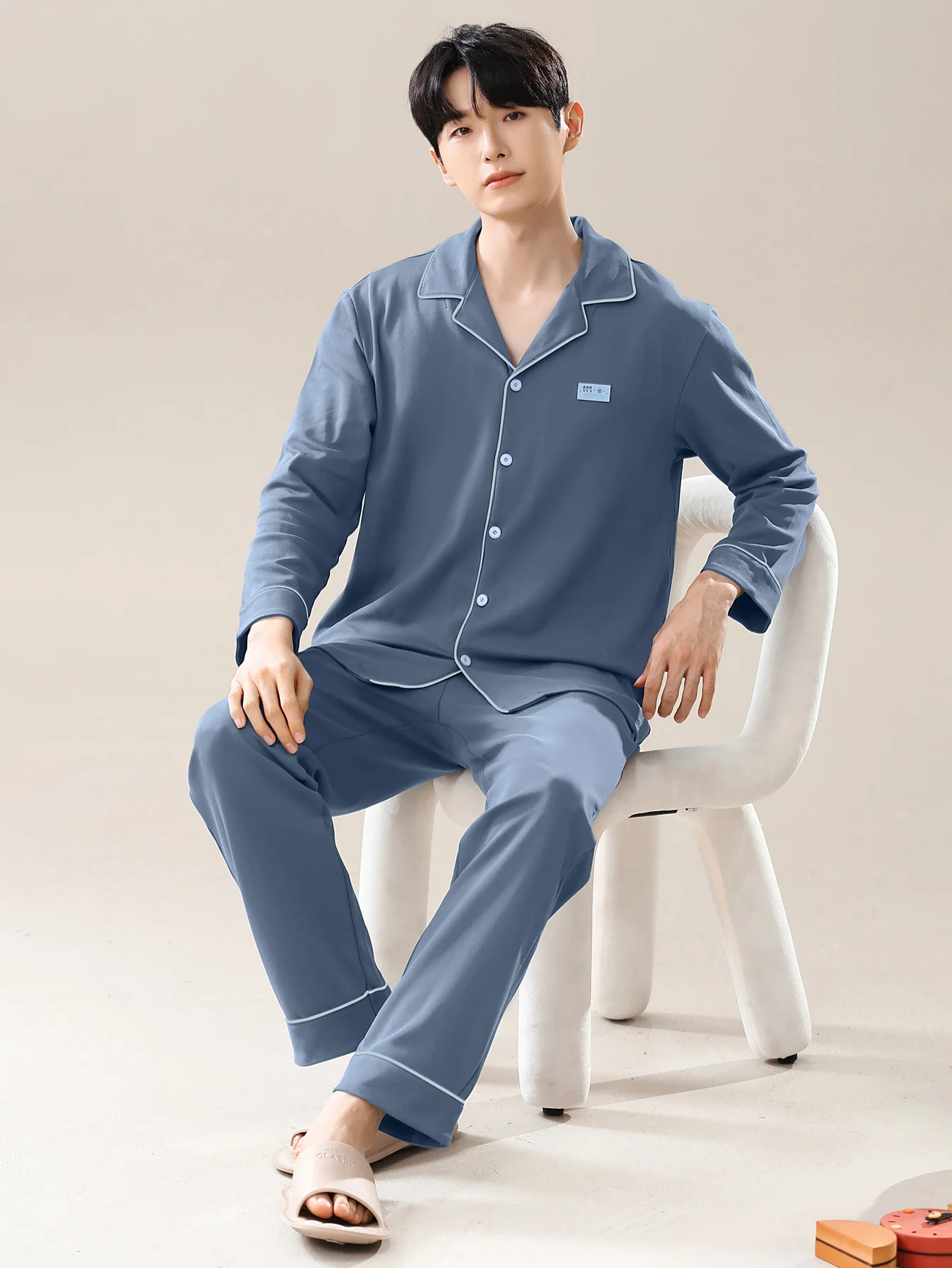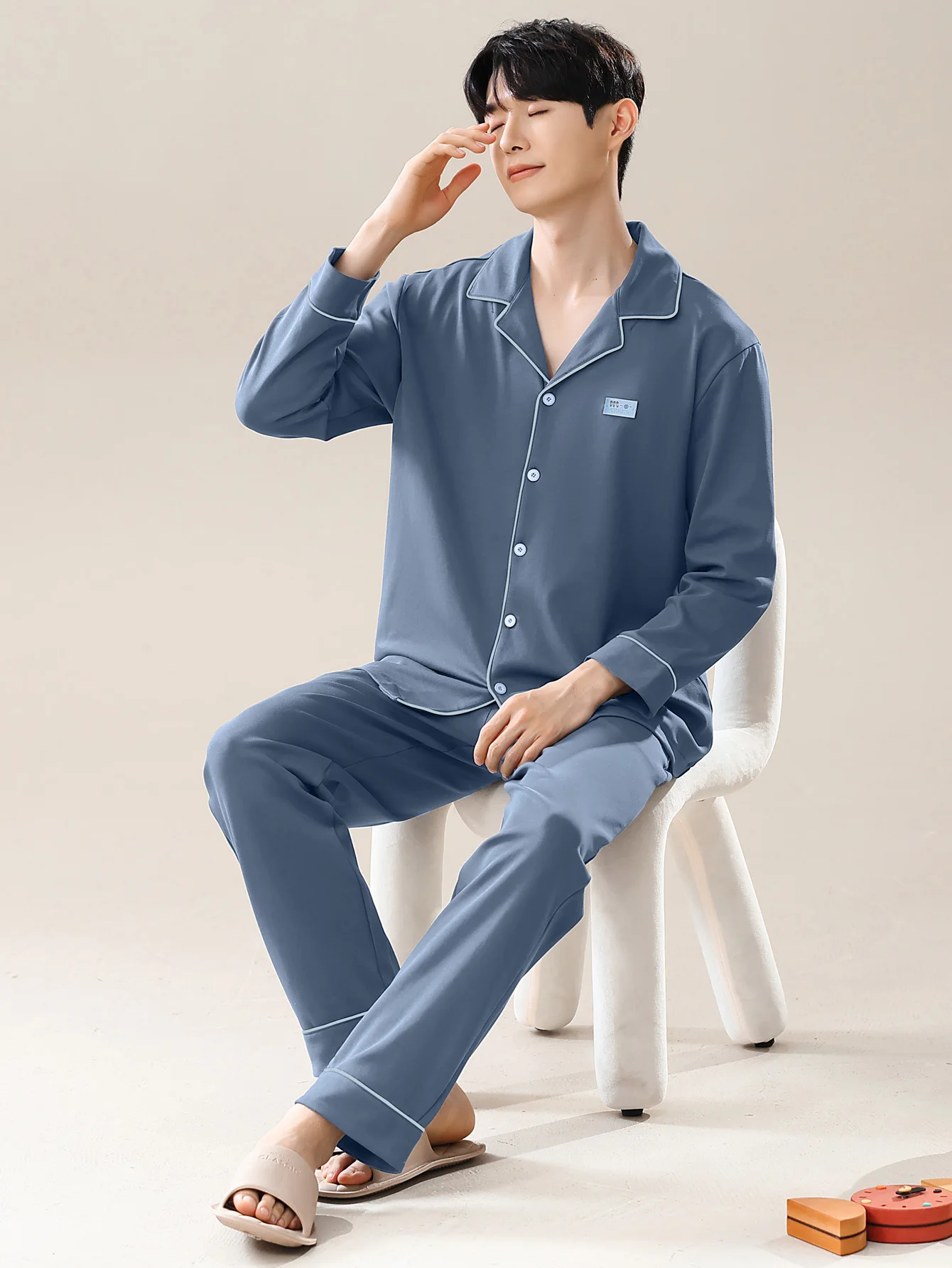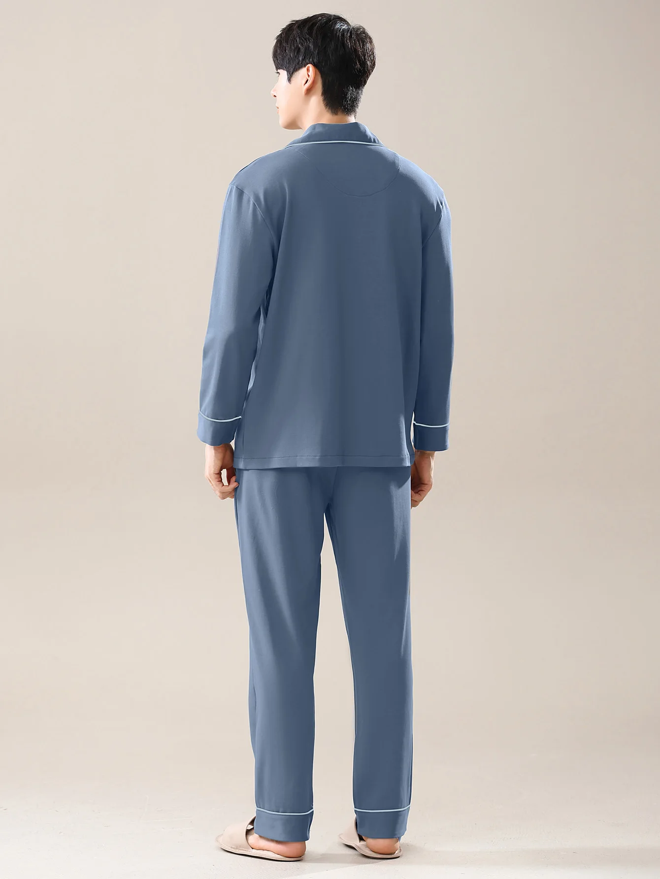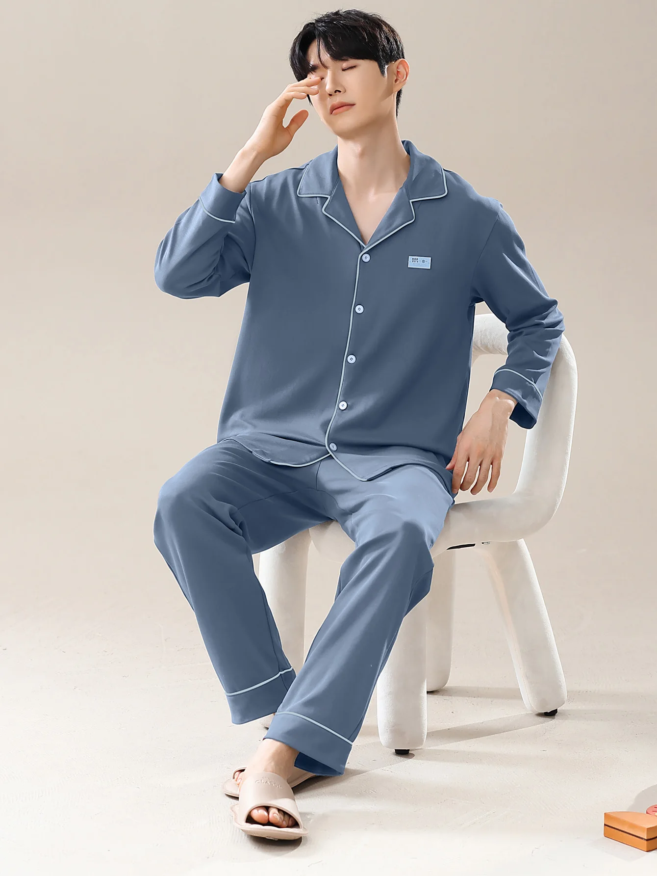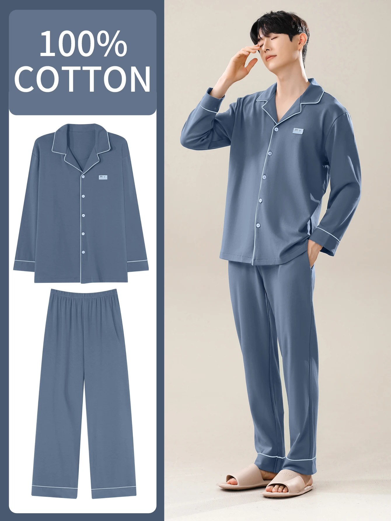Men's 100% cotton long sleeved four season plus size men's sleepwear, teenage pure cotton home suit set for warmth