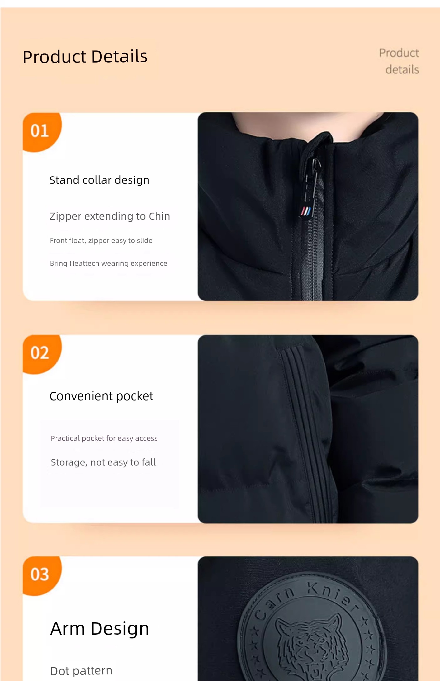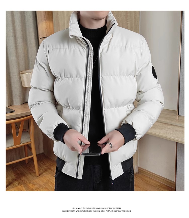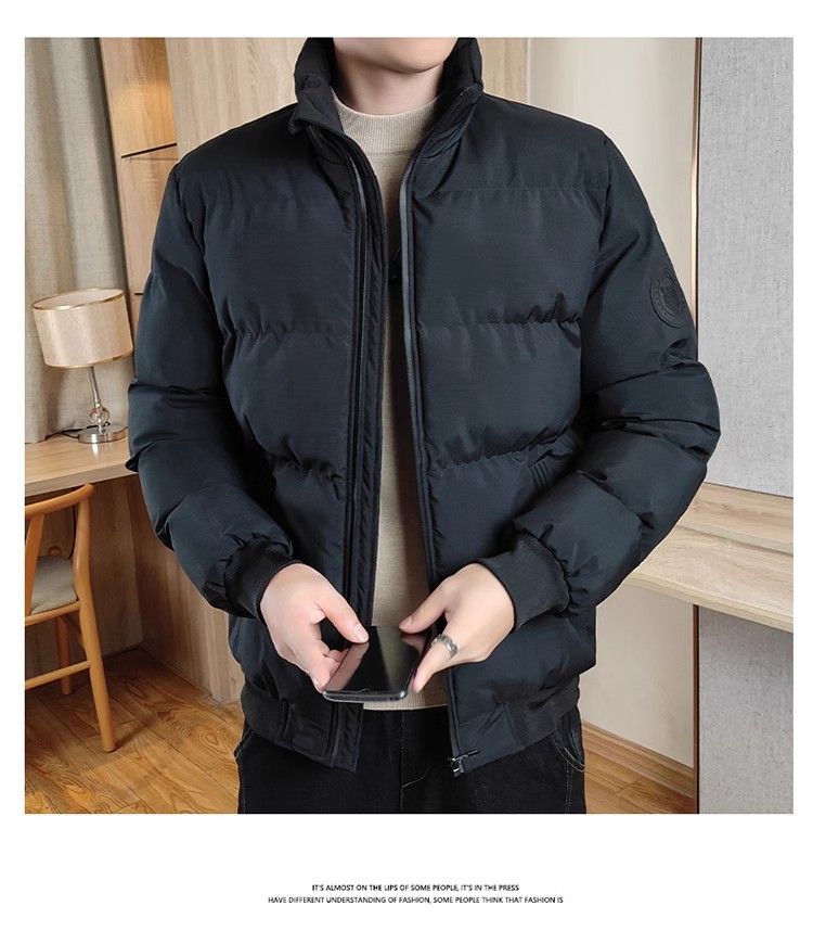 This men's down jacket combines thickened warmth with a sleek, slim fit design, perfect for cold winter days. Featuring a stand-up collar without a hood, it offers heattech insulation and a non-iron coated fabric for easy care. Its pure color and ribbed bottom add subtle style, while the regular length and loose sleeve openings ensure comfortable wear. Ideal for youth seeking both warmth and casual style in winter, this cotton-padded coat is a reliable choice for everyday outdoor use.