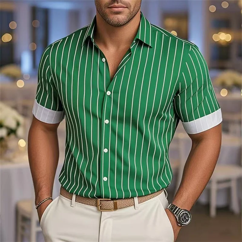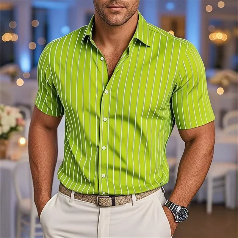 This men's fashion shirt features a loose fit with short sleeves and a stylish striped pattern, perfect for summer parties. Made from soft, breathable silk and microfiber, it offers comfort and casual elegance. The turn-down collar and single-breasted button closure add a classic touch, making it an ideal choice for relaxed yet fashionable wear.