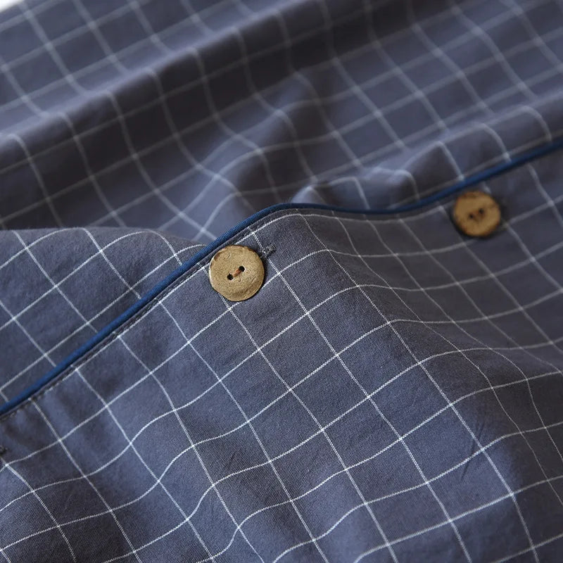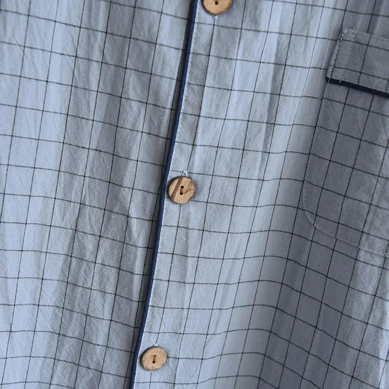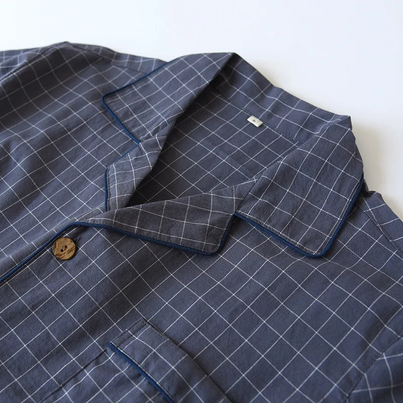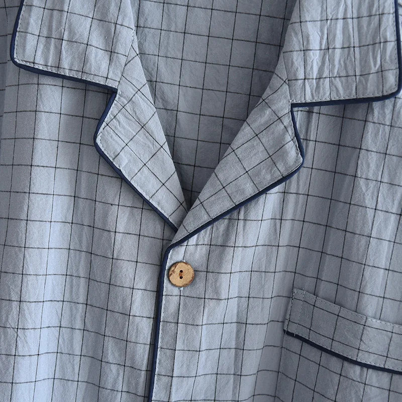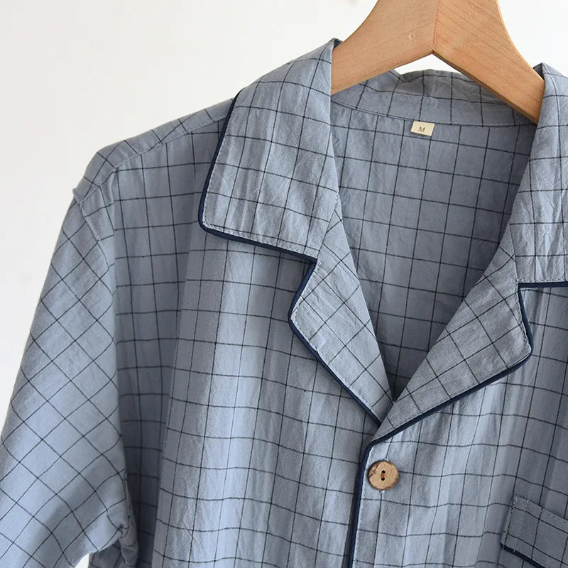 Elevate your nighttime comfort with our Men's Summer Pajamas. Made from premium washed cotton, these lightweight sleepwear sets feature a sophisticated turn-down collar and convenient button-fly closure. The classic Japanese-inspired plaid pattern offers timeless style, while the short sleeves and shorts design keeps you cool during warm nights. Perfectly balanced with normal thickness fabric, these pajamas combine breathability with durability for the ultimate sleeping experience. Embrace simplicity and comfort in one stylish package that's designed specifically for discerning men.