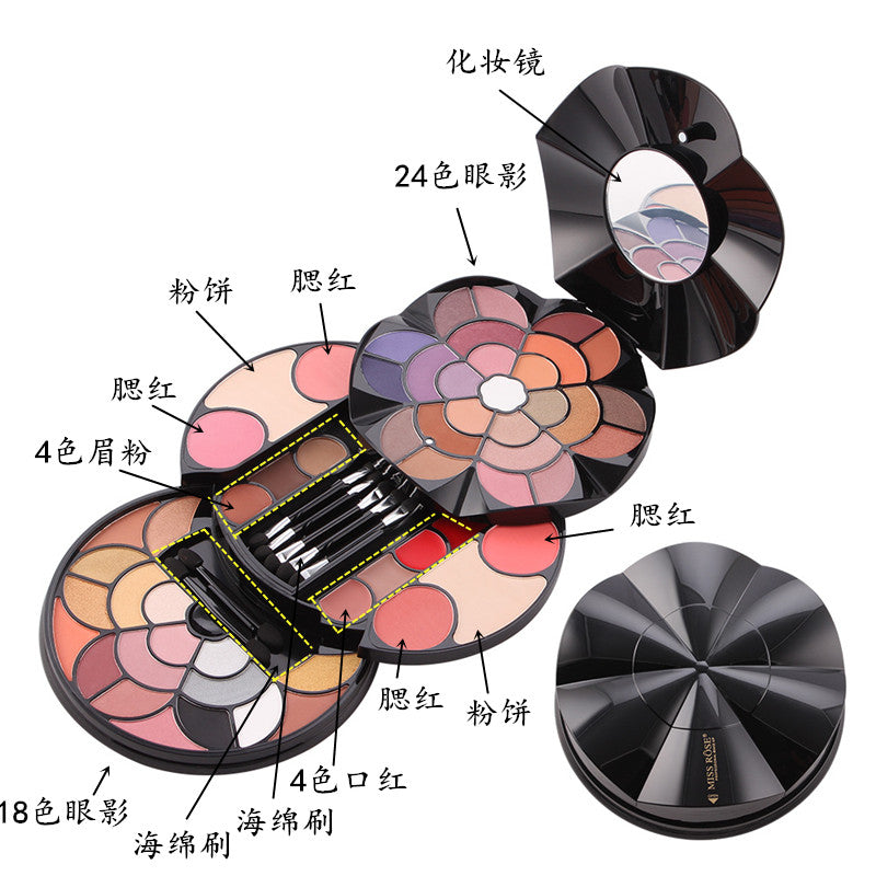This makeup box, with a production license number 20160240 from Cosmetics Co., LTD, contains 8 or more colors and various textures, making it suitable for any skin type. Use it to groom your eyes, contour your face, or create a stunning eyeshadow look. Give yourself or someone special the gift of the 7002-004 MAKE UP from MISS ROSE, packaged in a basic piano box. Tis product boasts 973g of net content and a shelf life of 5 years. Elevate your makeup game with Genuine 190 Color Matte Makeup Gift Blush.