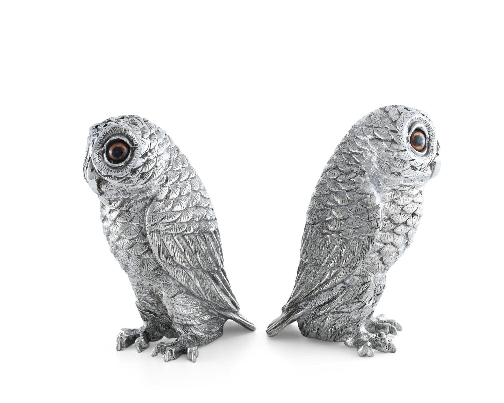 Add intrigue and elegance to your dining table with the beautifully defined Owl Salt and Pepper Set from the Harvest Collection. Exhibit your excellent taste in unique, luxury-grade pewter plated decor pieces. With amber eyes and whimsical expressions, the owls stand at an ideal compact size of 3.25" W x 3.75" T, perfect for overseeing the food and company at your table while adding a visually appealing touch to your decor
