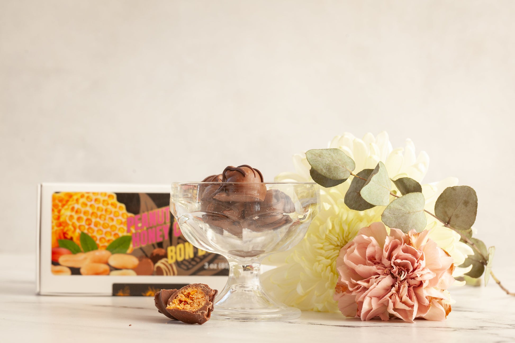 Indulge in our decadent Peanut Butter Honeycomb Crunch Bon Bons. These treats feature a fluffy peanut butter center mixed with crunchy honeycomb candy bits, all enrobed in velvety milk chocolate and drizzled with dark chocolate. A rich and unique confection for special occasions or everyday indulgence.
