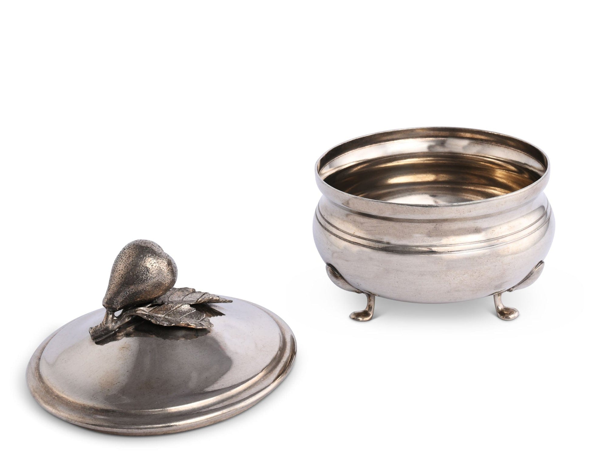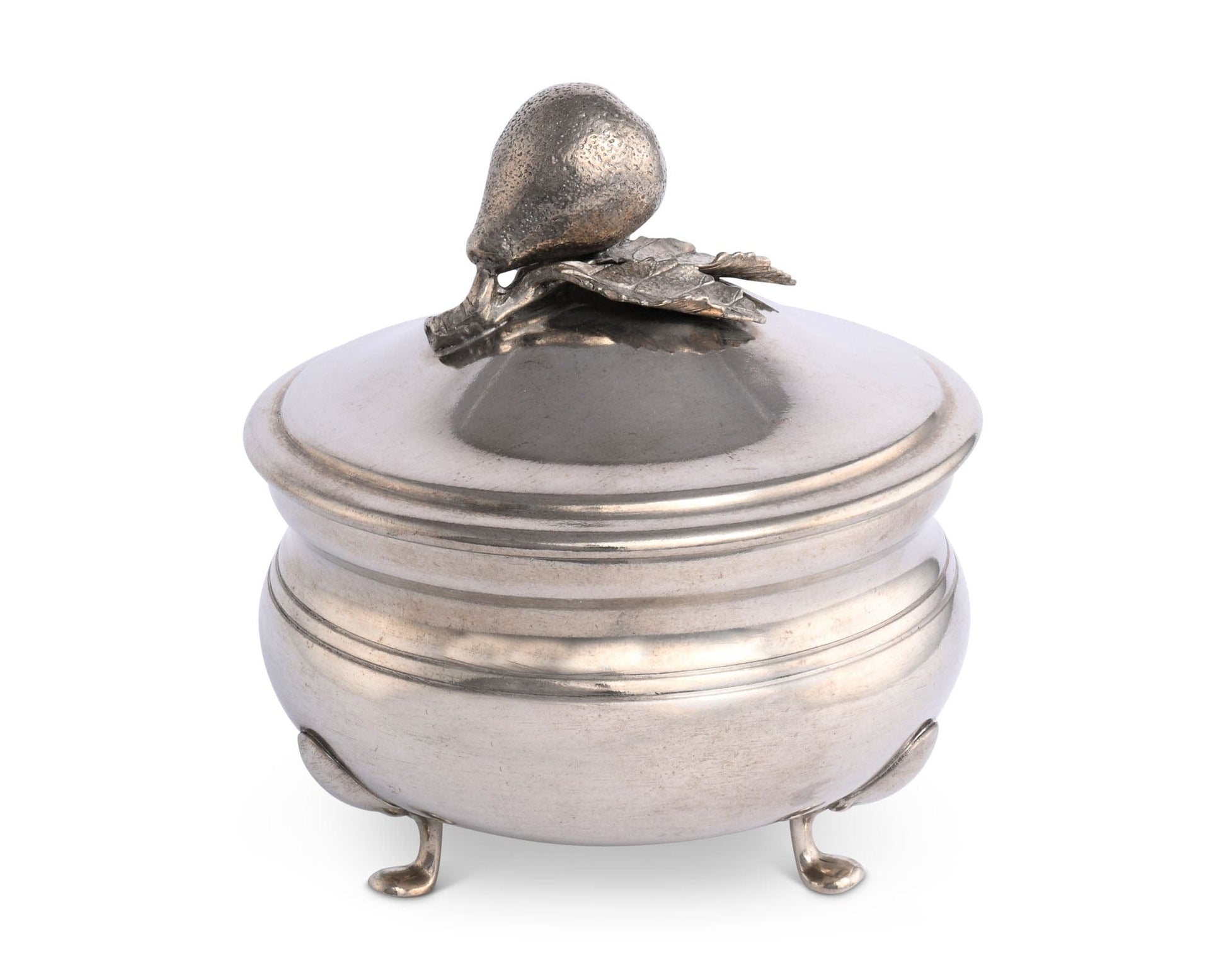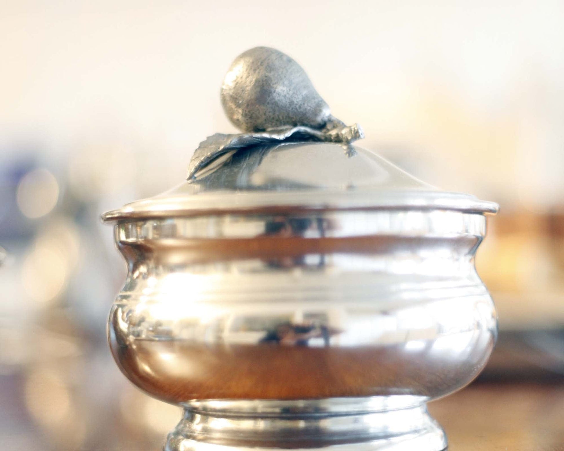 Accentuate your festive spread with the Harvest Collection's Pear Sauce Bowl. An embodiment of classic elegance, this designer piece exhibits a pear-shaped profile crafted intricely from luxury-grade pewter, a perfect fusion of form and function. The compact size of 5" L x 5" W x 6" H enables easy serving during dinner parties while adding an artistic flair. Pewter's signature finish offers a timeless aesthetic, and the tri-footed base adds stability, making it the best luxury gift for hosts.
