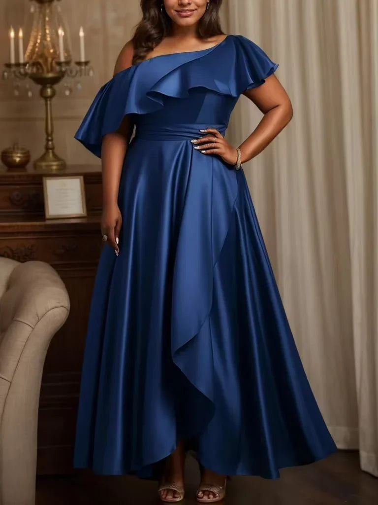 Plus Size Elegant Evening Dress Satin Ruffle One Shoulder Party Cocktail Maxi Dress