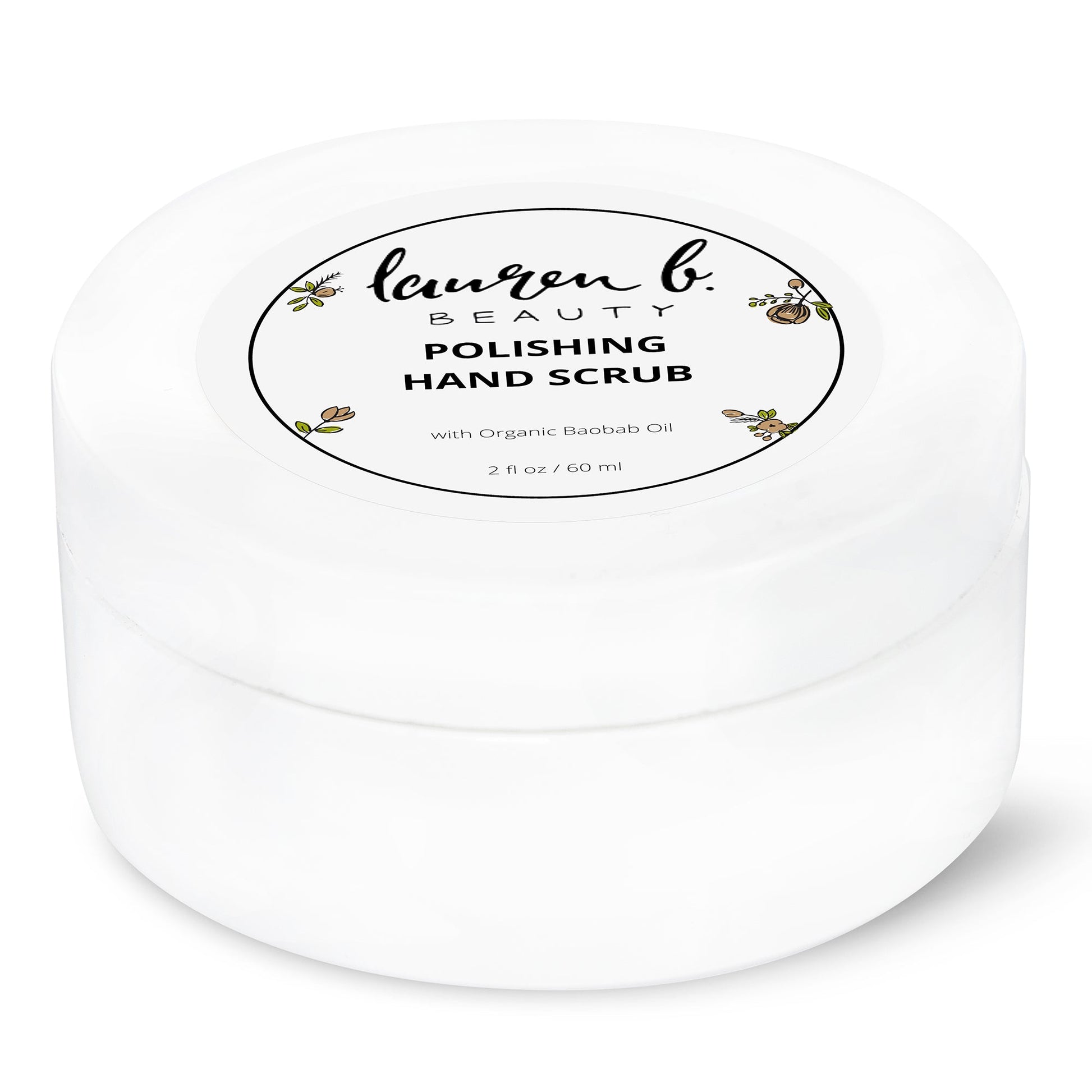 Lauren B. Beauty Hand Scrub - an eco-friendly exfoliator, potent anti-ager, and hydrator in one. Brighten, soothe, heal chapping and protect against environmental damage. Vitamin E, Aloe Oil, Organic Boabab Oil, Cocoa Butter, Coconut Oil, Sunflower Seed Oil, and Swiss-derived Green apple stem cells combine to revive and smooth the thin skin on your hands.