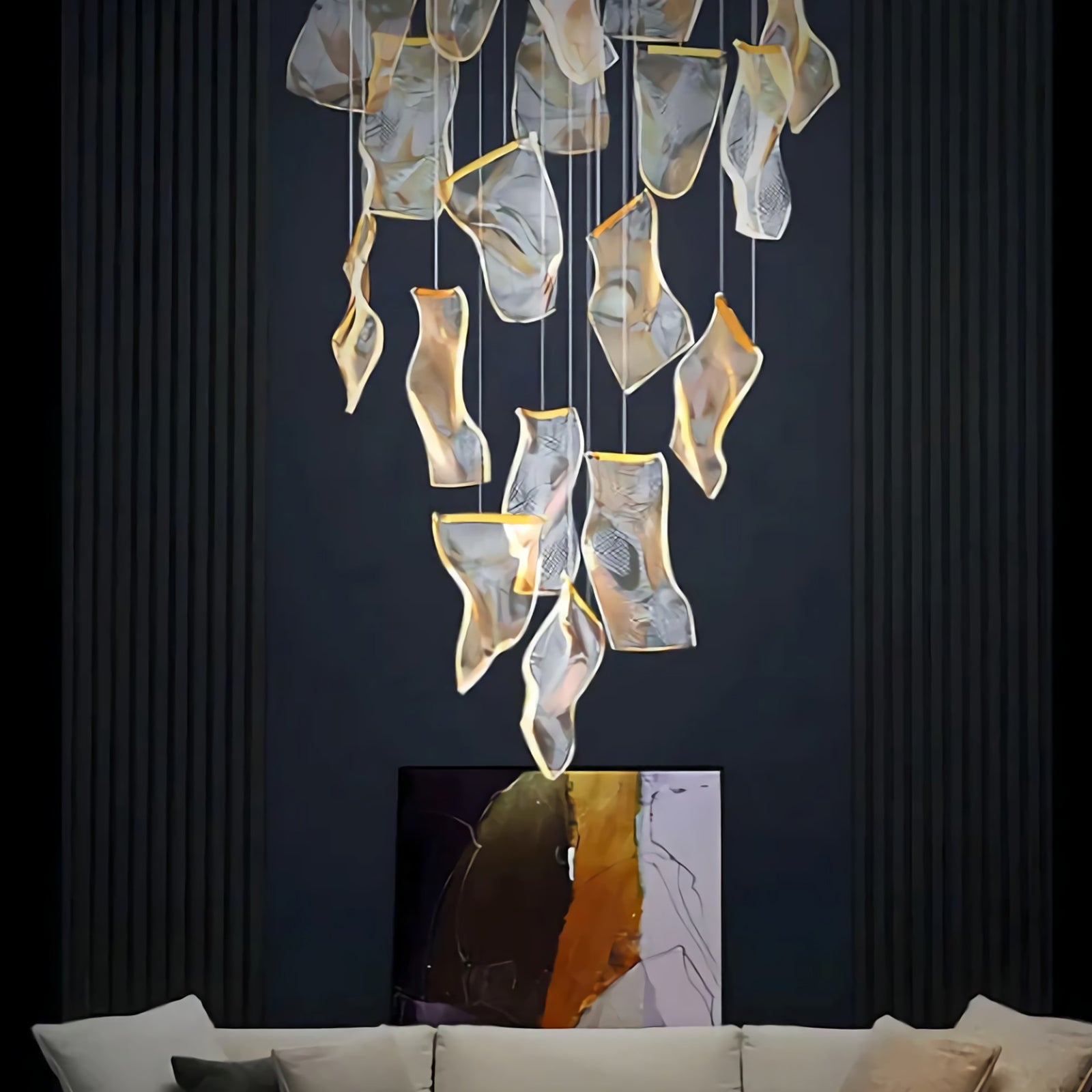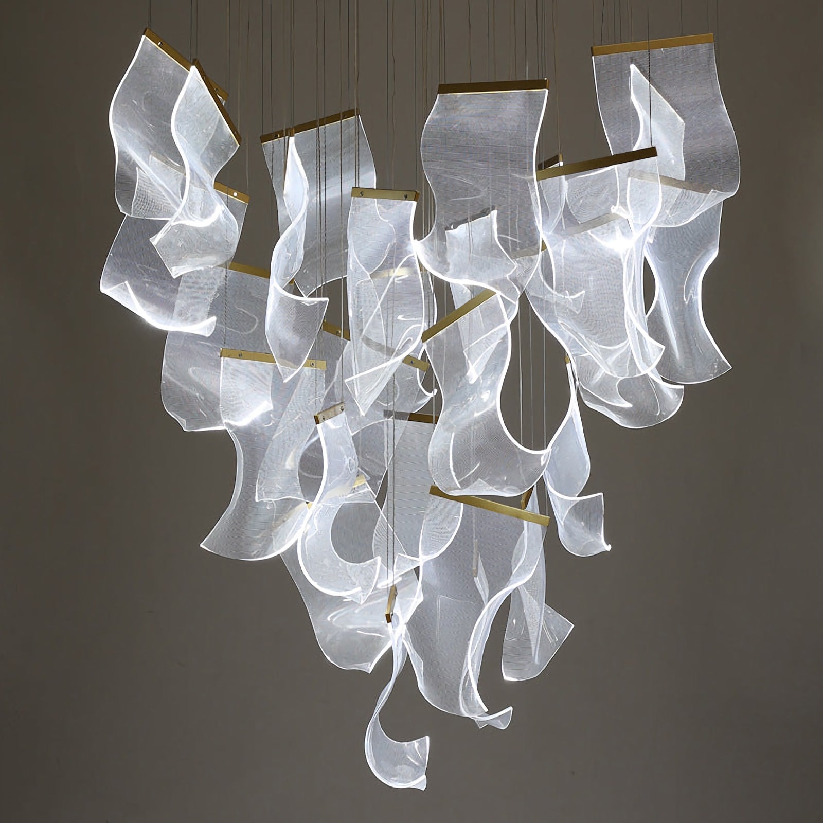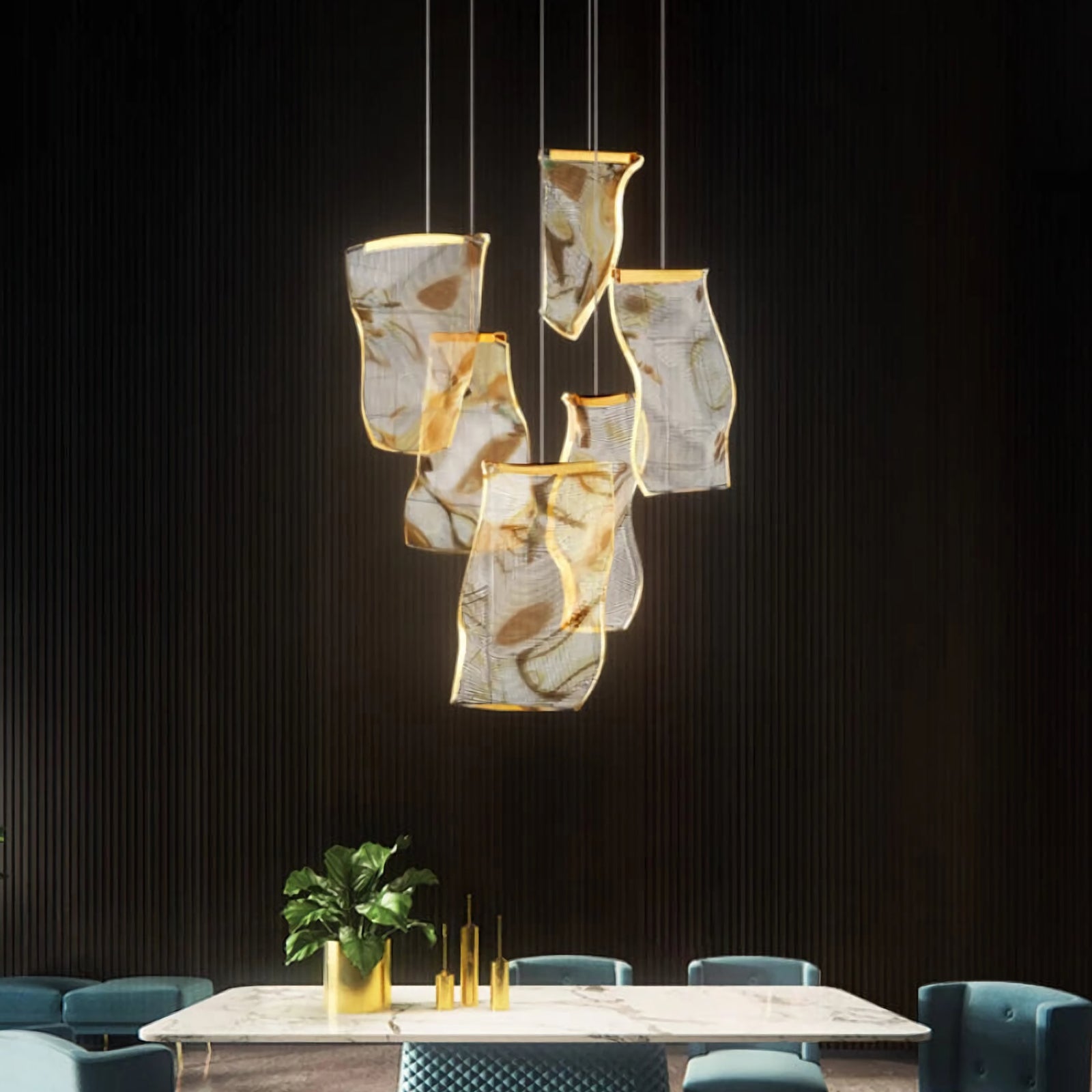 This spectacular Postmodern Creative Chandelier from korewolamp is a true work of art designed to be a showstopping centerpiece. It features seven individual pendants, each suspended at a different height, creating a dynamic, floating arrangement. The shades are the most striking element: they are crafted from a textured, sheer material with an abstract, marble-like pattern in gold and cream tones, shaped into organic, undulating forms that resemble flowing fabric. The perimeter of each shade is subtly illuminated, defining its fluid shape and casting a warm, artistic glow. This fixture is perfect for adding a sense of avant-garde luxury and soft, dramatic lighting to a modern dining room or high-end living area.