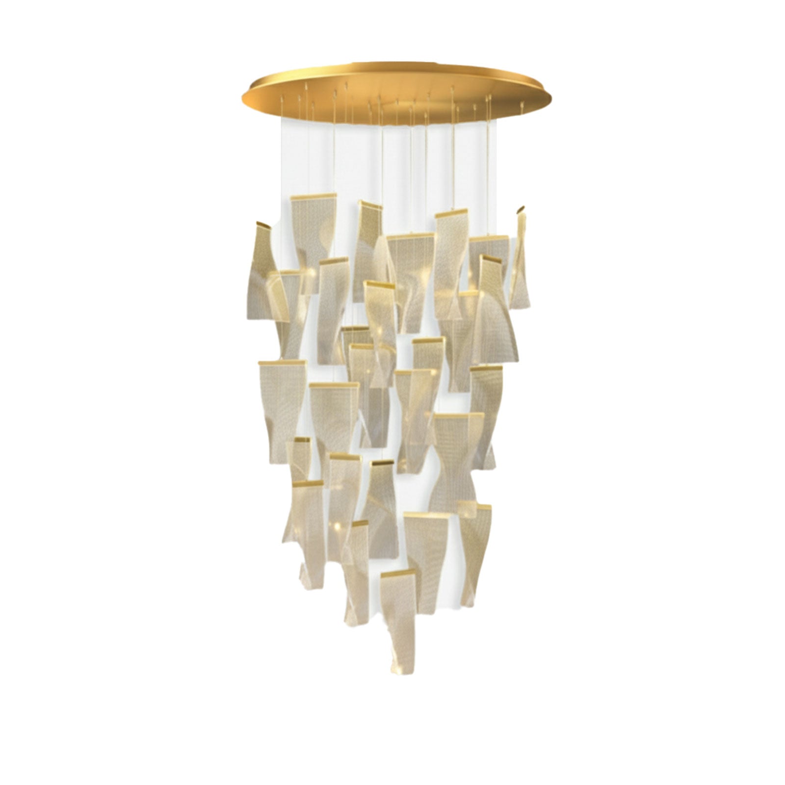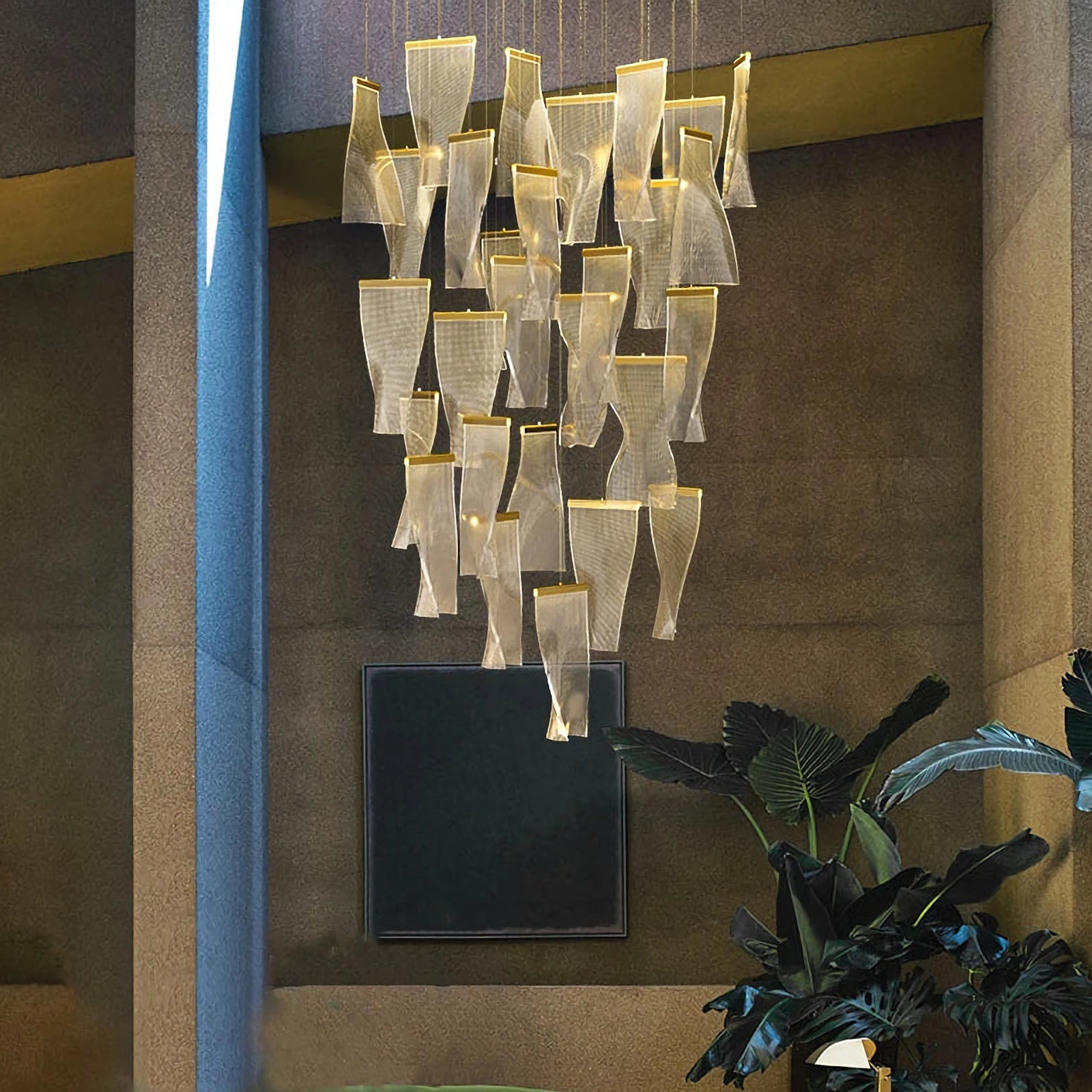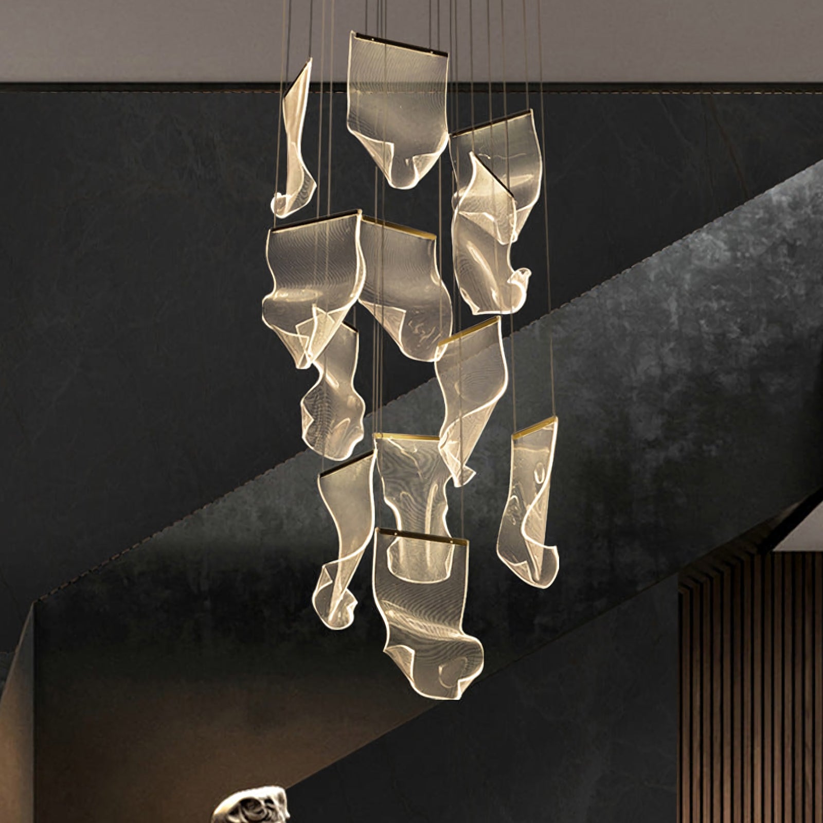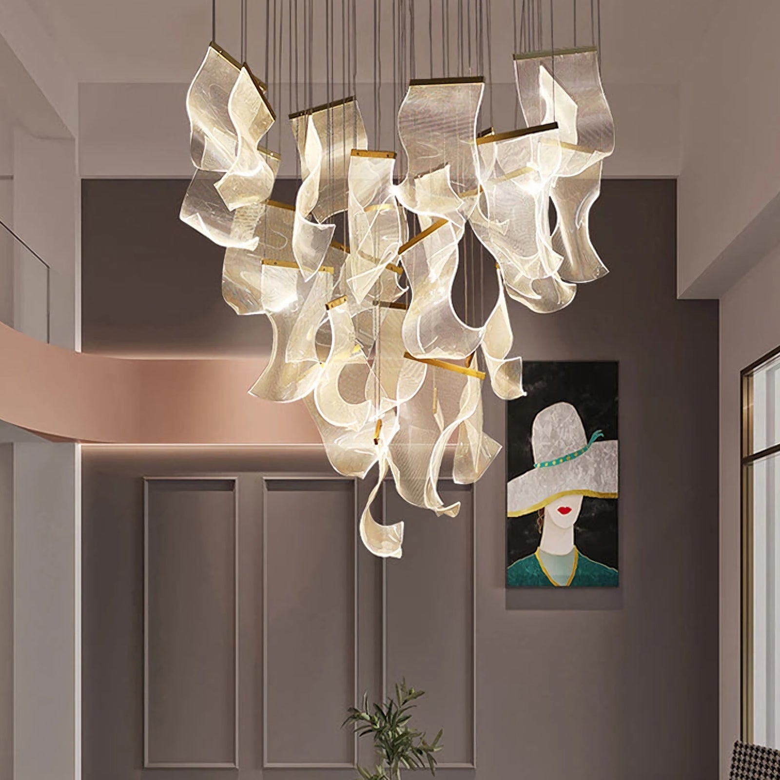 This spectacular Postmodern Creative Chandelier from korewolamp is a true work of art designed to be a showstopping centerpiece. It features seven individual pendants, each suspended at a different height, creating a dynamic, floating arrangement. The shades are the most striking element: they are crafted from a textured, sheer material with an abstract, marble-like pattern in gold and cream tones, shaped into organic, undulating forms that resemble flowing fabric. The perimeter of each shade is subtly illuminated, defining its fluid shape and casting a warm, artistic glow. This fixture is perfect for adding a sense of avant-garde luxury and soft, dramatic lighting to a modern dining room or high-end living area.