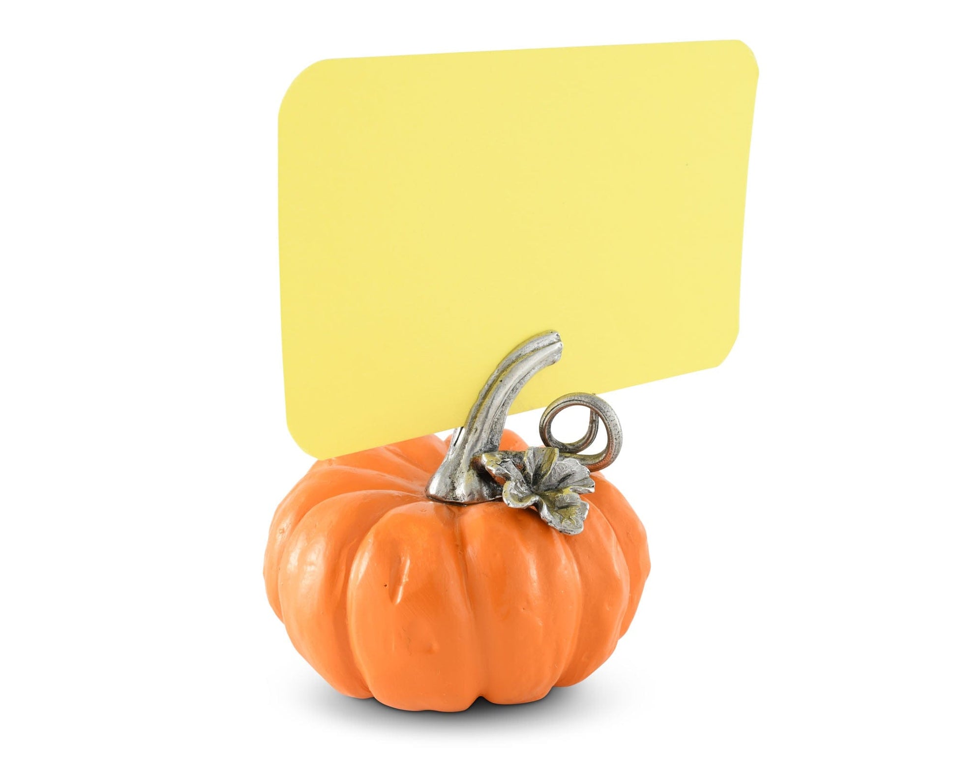 Enhance your classy dining experience with this designer handcrafted Pumpkin Place Card Holder from Vagabond House's Harvest Collection. This compact pumpkin, realistically sculpted in poly resin, is perfect for adding a seasonal pop of color to your table setting. It showcases deep detailed pattern grooves that reflect skilled craftsmanship. The pumpkin is crowned with an intricately designed leaf and vine at the base of the pure-pewter stem, a perfect holder for place cards. Its detail and hand-painted finish highlight its high-quality material and build.