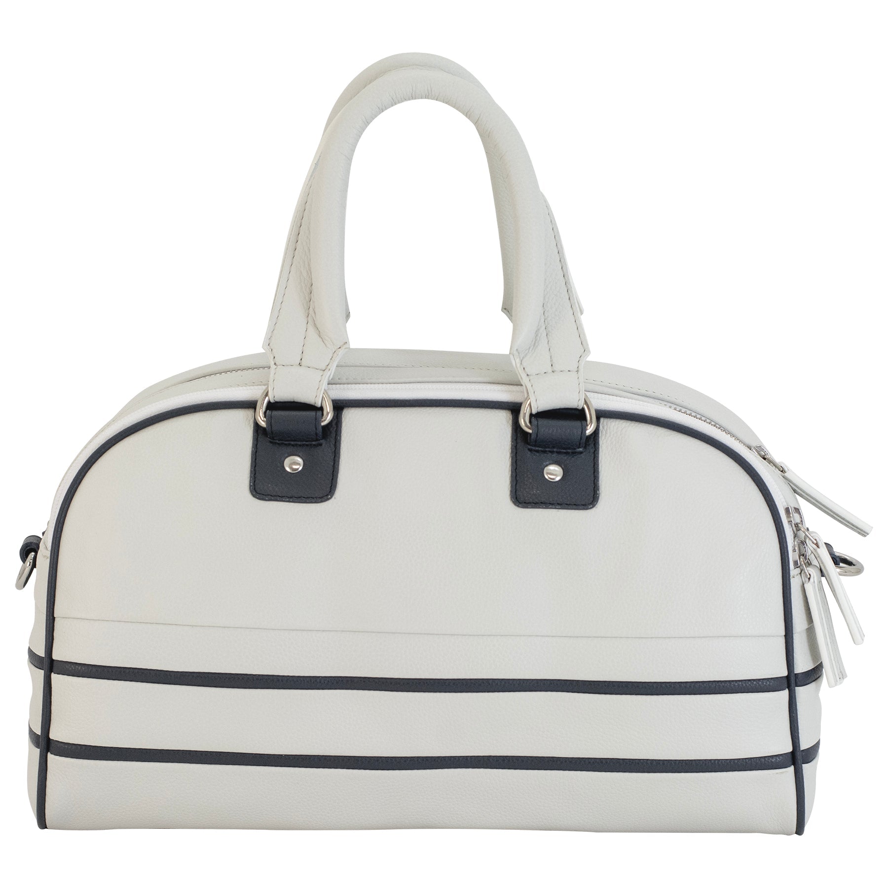 This concealed carry bowling bag is a perfect blend of style and functionality, crafted from soft white leather with contrasting navy blue trims. It exudes sophistication and discretion, ensuring that it's as suitable for professional environments as it is for casual outings.