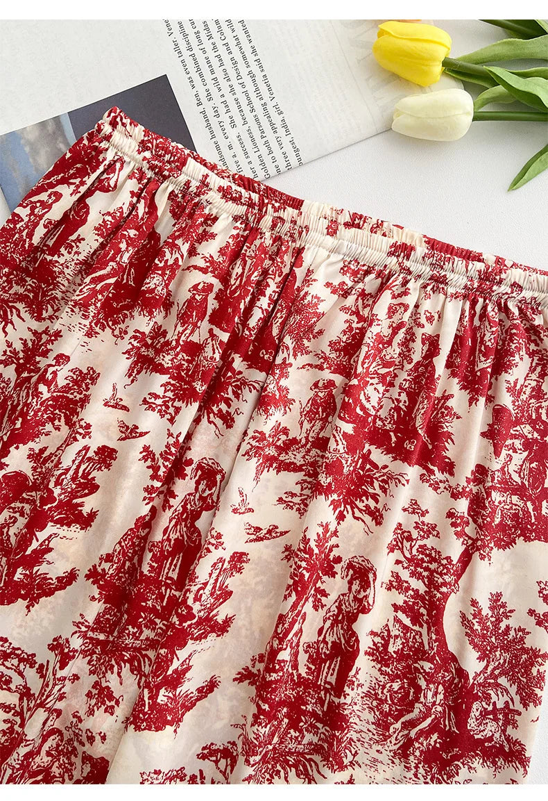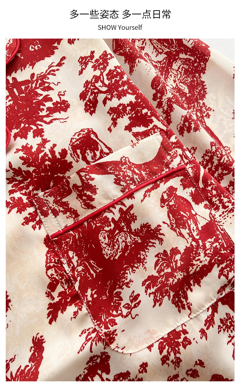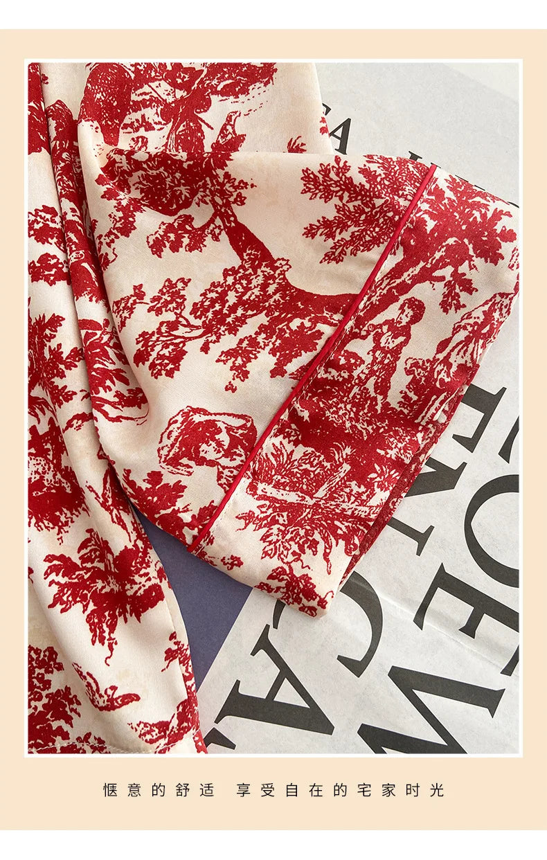Indulge in alluring comfort with our Red Sexy Pajamas Set. This sophisticated two-piece ensemble features an elegant lapel shirt paired with ankle-length pants, crafted from luxurious satin polyester and rayon blend. The turn-down collar adds a touch of classic style, while the lightweight, thin fabric drapes beautifully against your skin. Perfect for summer nights or spring evenings, this printed nightwear combines sensual appeal with practical comfort. Transform your bedtime routine into a glamorous experience with this irresistible set designed specifically for the confident woman who appreciates both style and comfort.