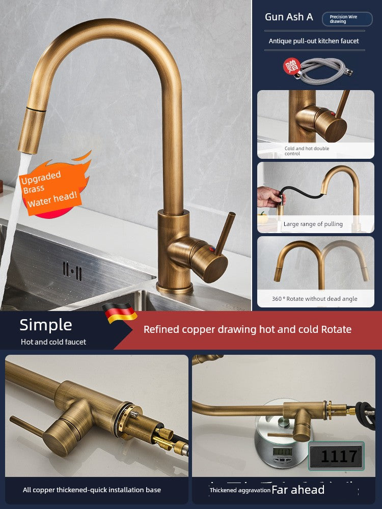 Retro Copper Antique Kitchen Faucet Hot and Cold Wash Basin Sink Pull-out Rotate