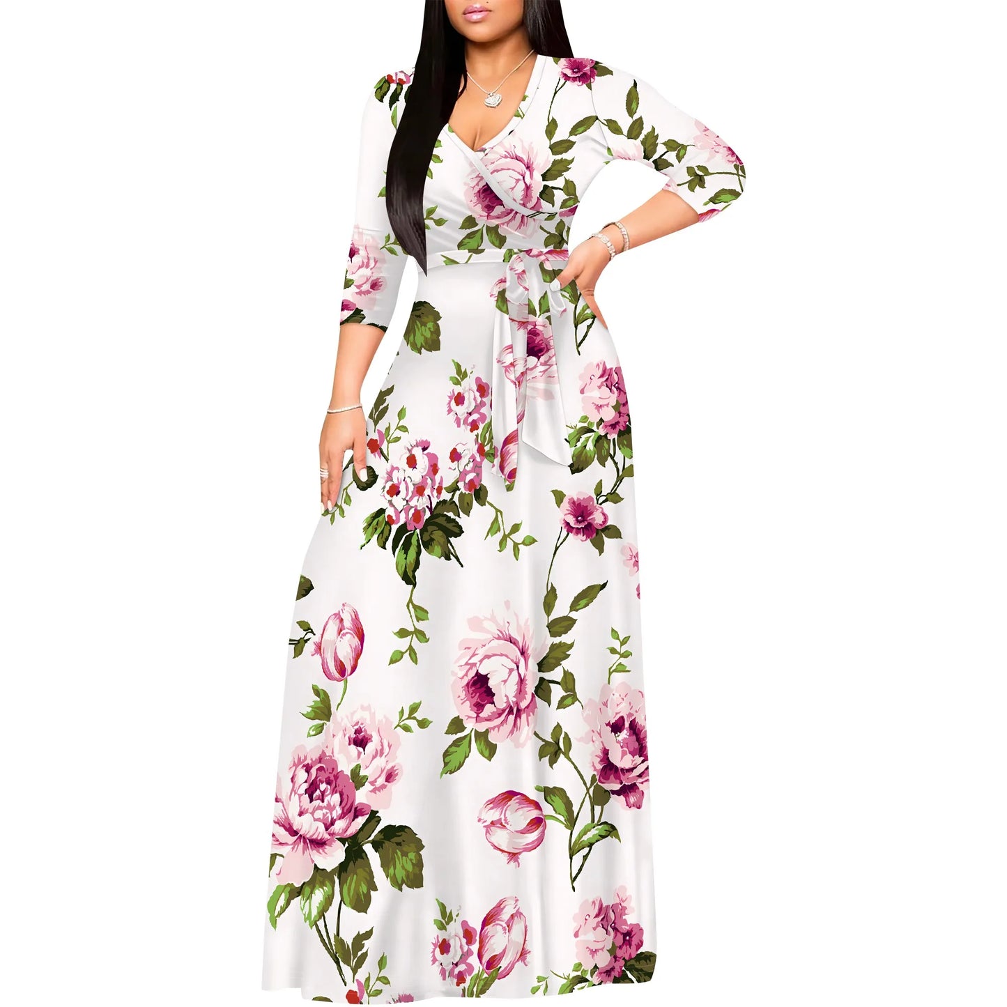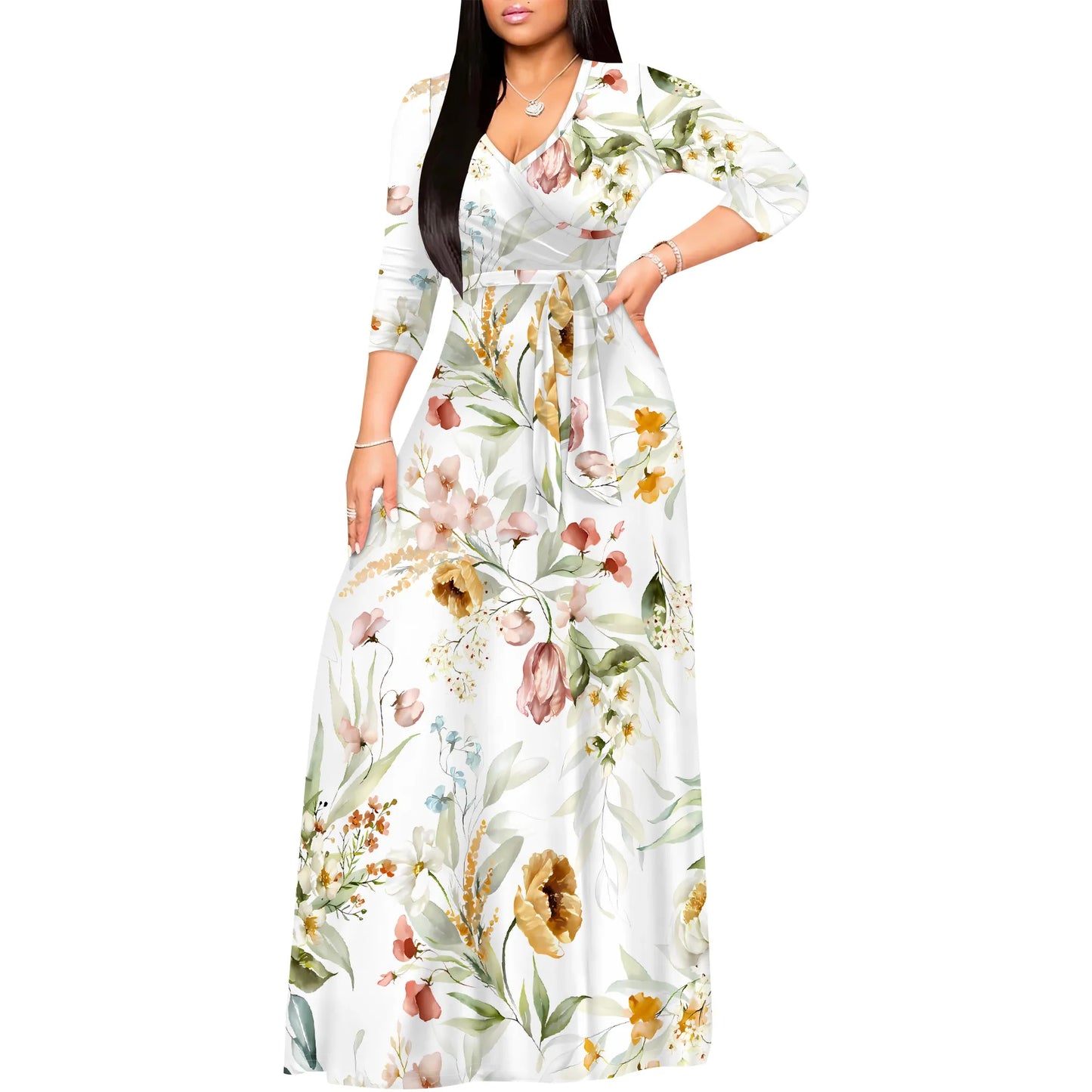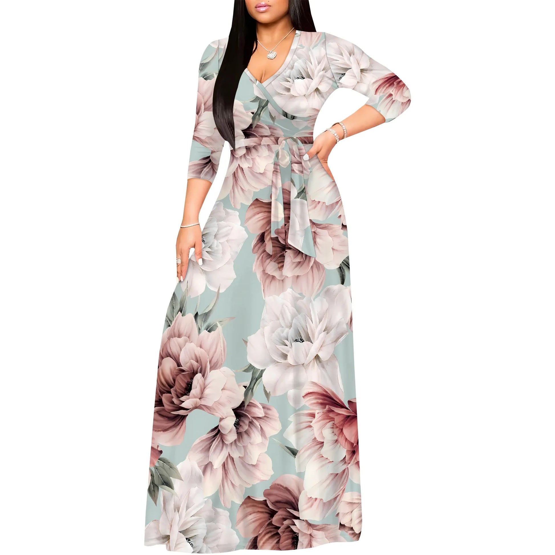 Romantic Floral Rose V-Neck 3/4 Sleeve Wrap Maxi Dress with Belt