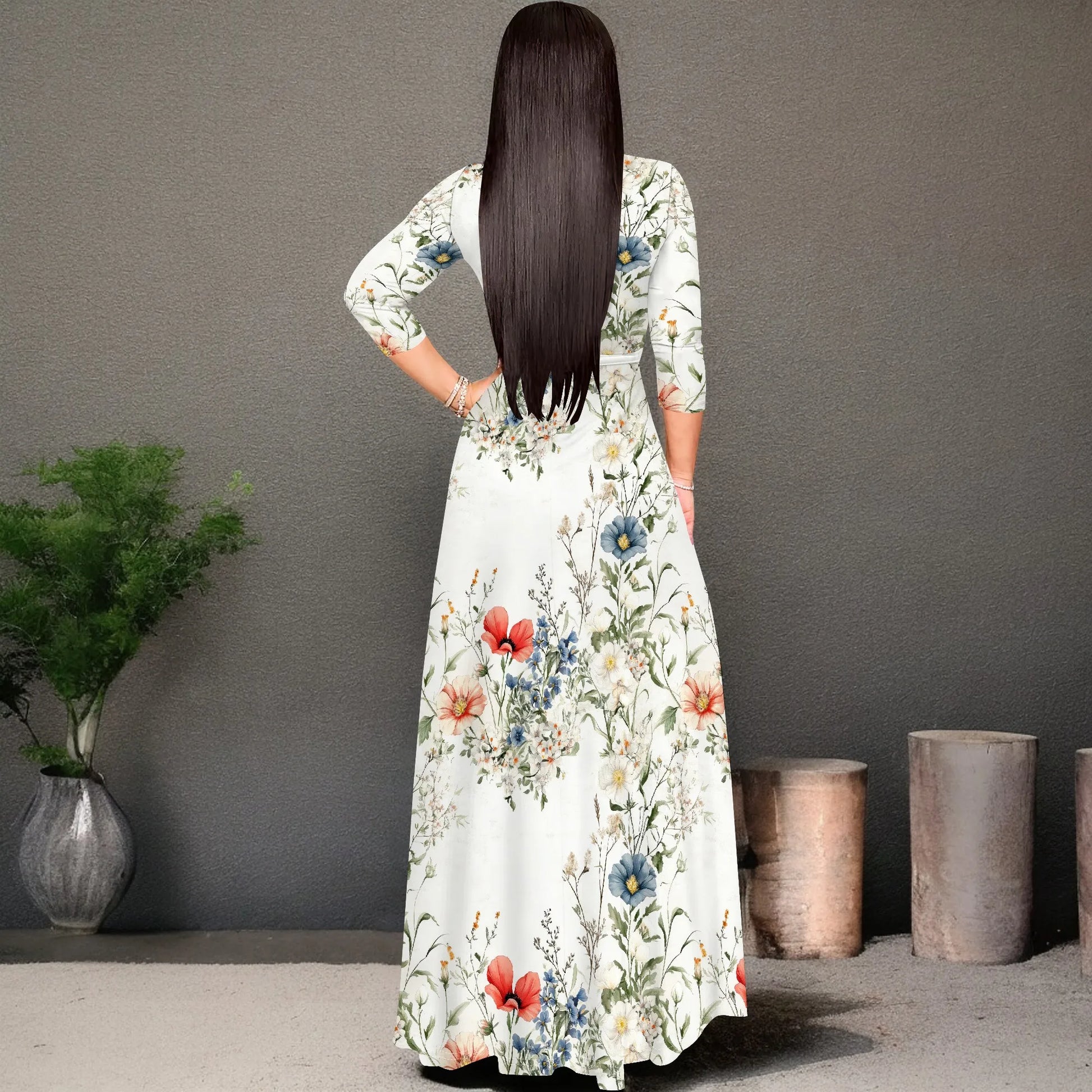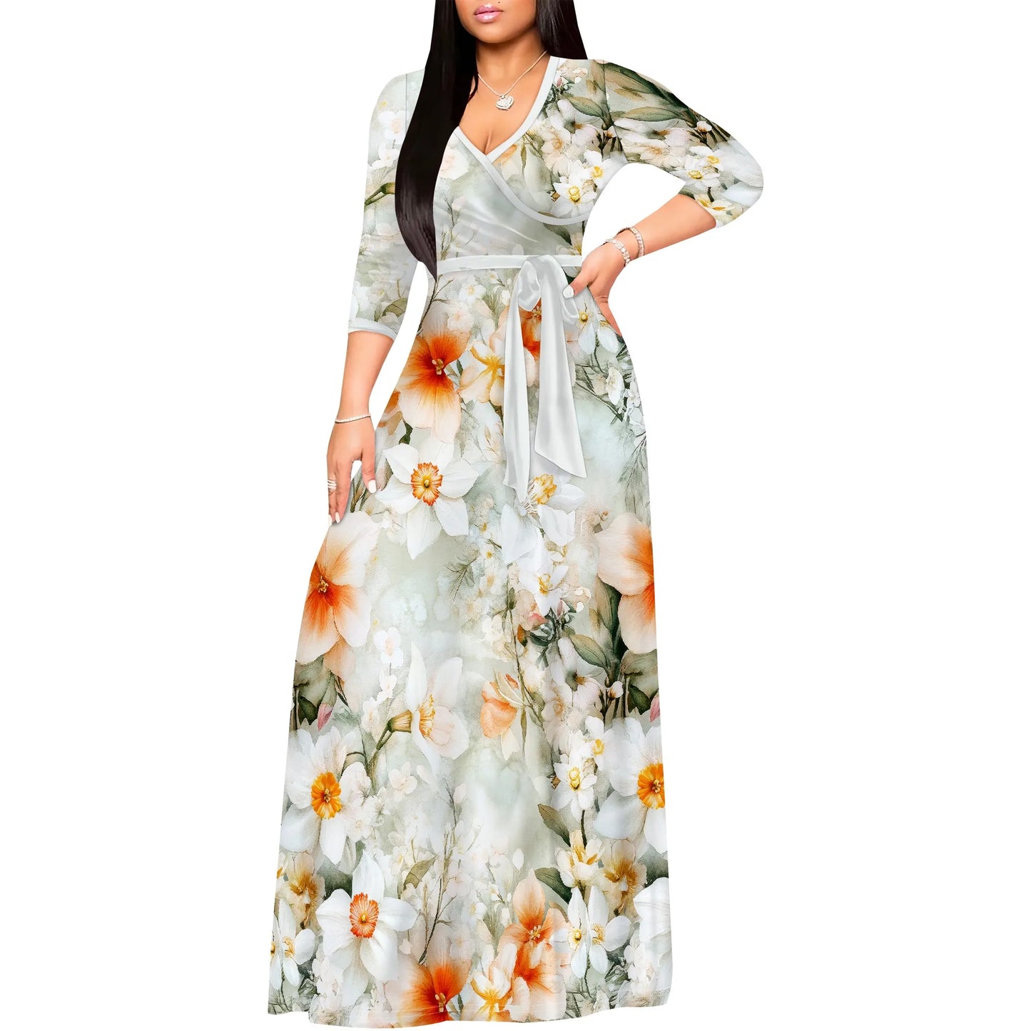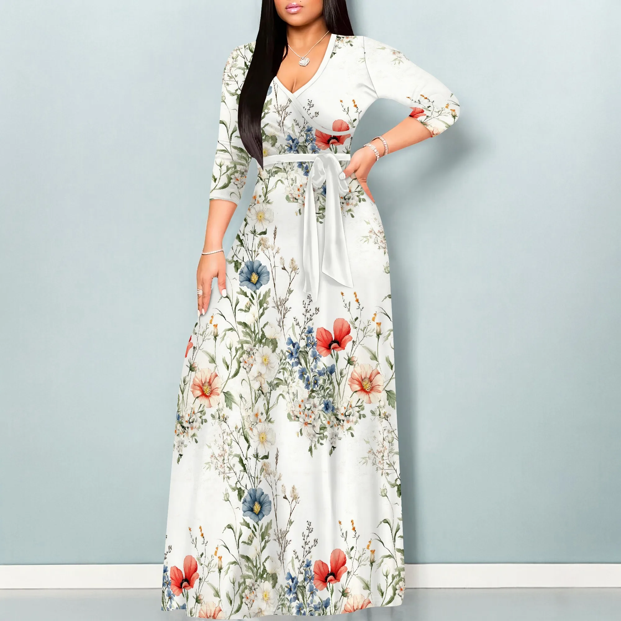 Romantic Floral V-Neck 3/4 Sleeve Wrap Maxi Dress with Belt