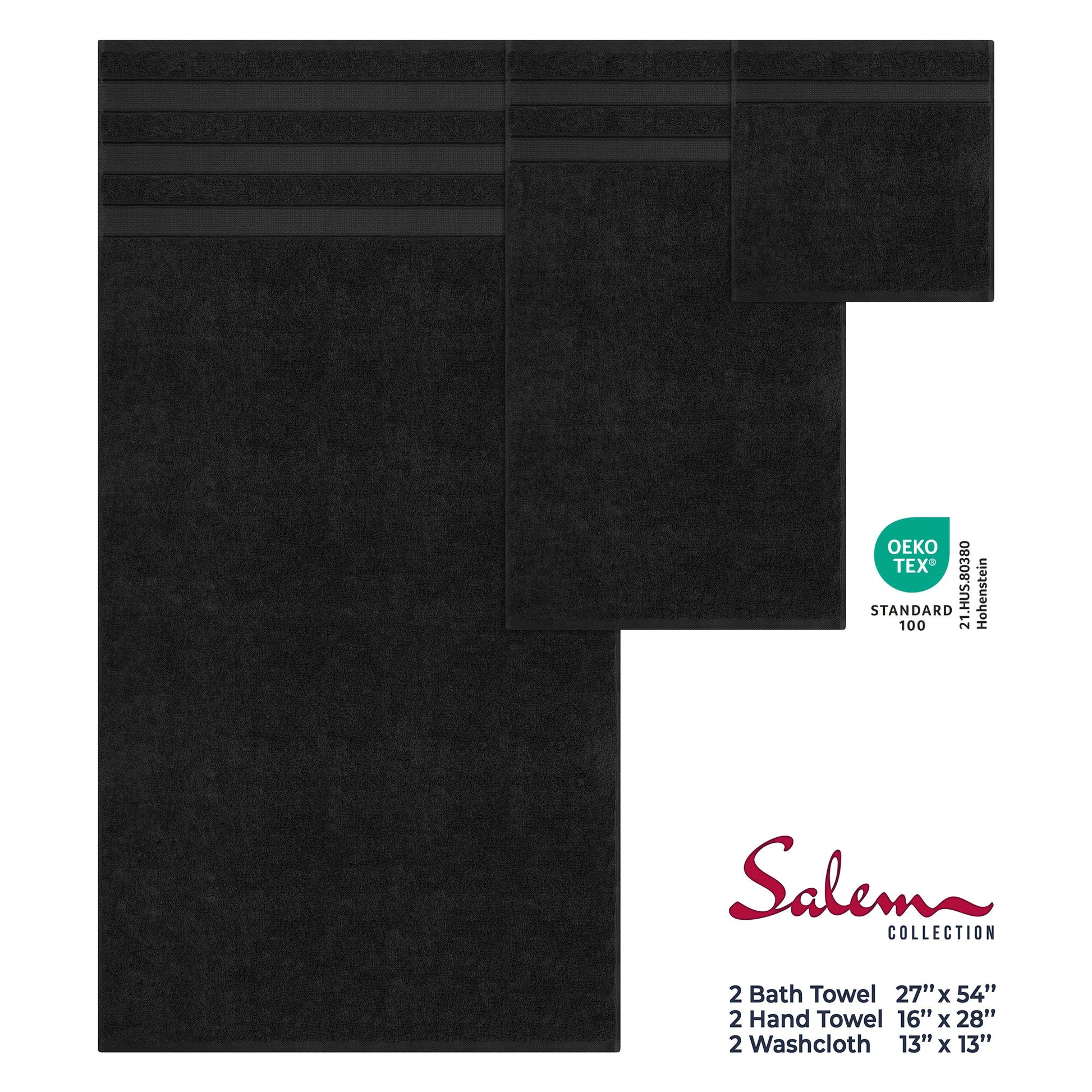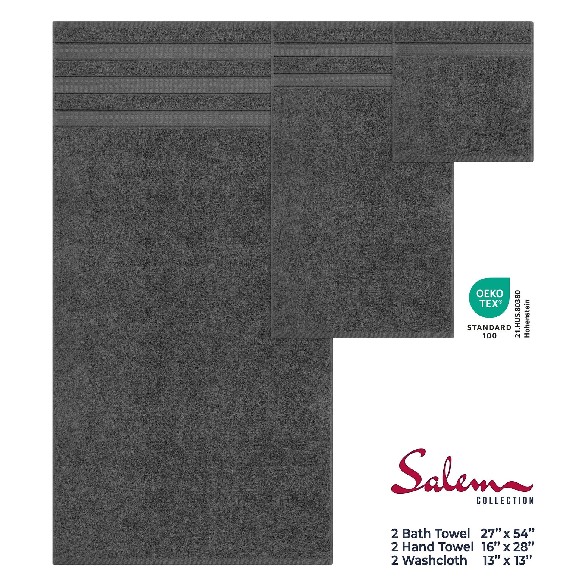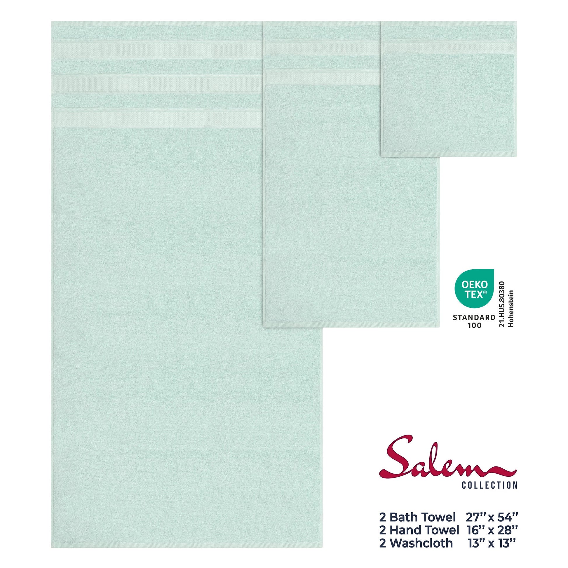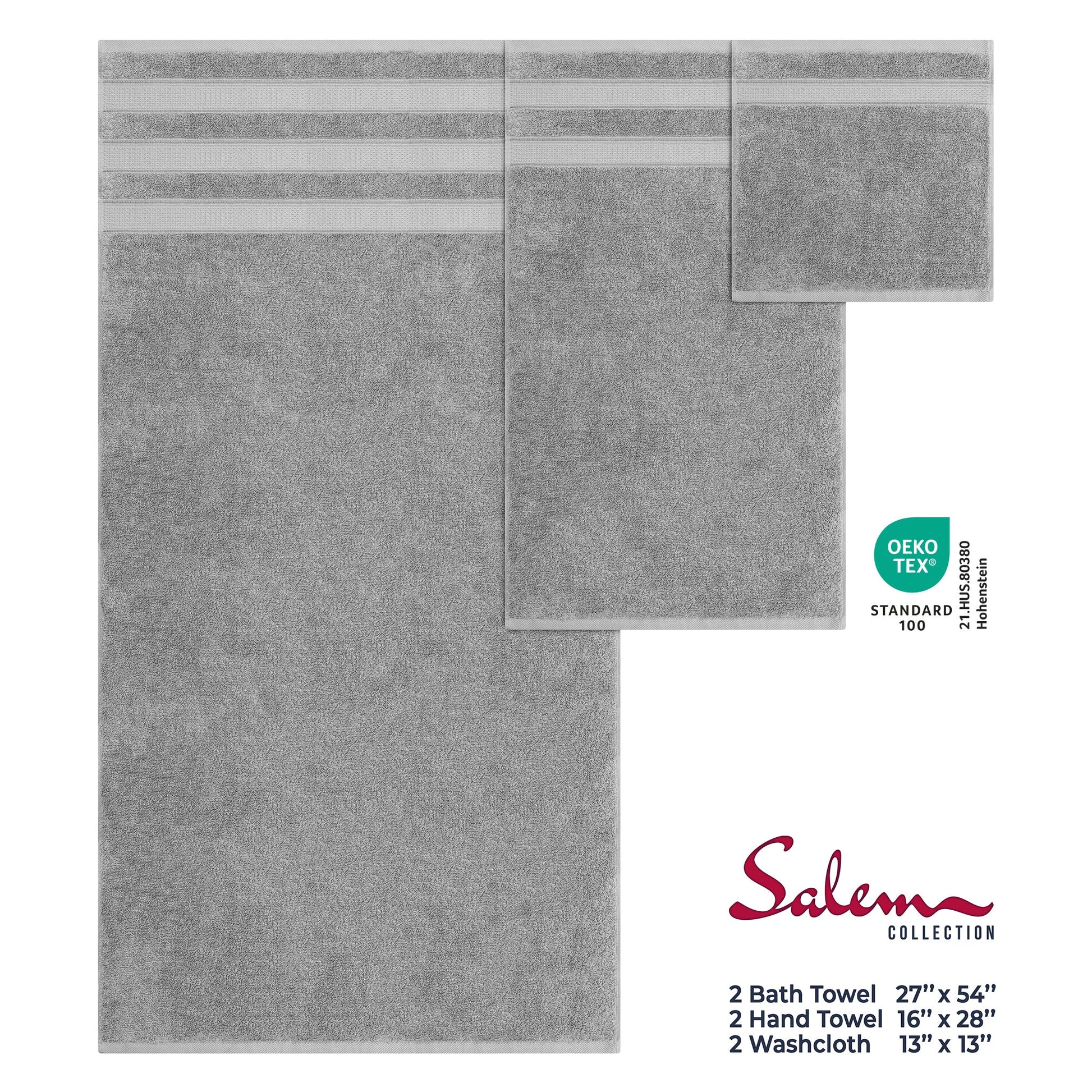 Whether you're upgrading your master bath, outfitting your Airbnb, or looking for the perfect housewarming gift, Salem towels offer the ultimate blend of comfort and style. With superior absorbency and a soft touch that gets even better with each wash, these towels are your go-to for elevated living. OEKO-TEX® STANDARD 100 keeps you and your family safe by testing [each component of] a certified product against a list of over 1,000 harmful substances. Certificate #21.HUS.80380 by Hohenstein.
