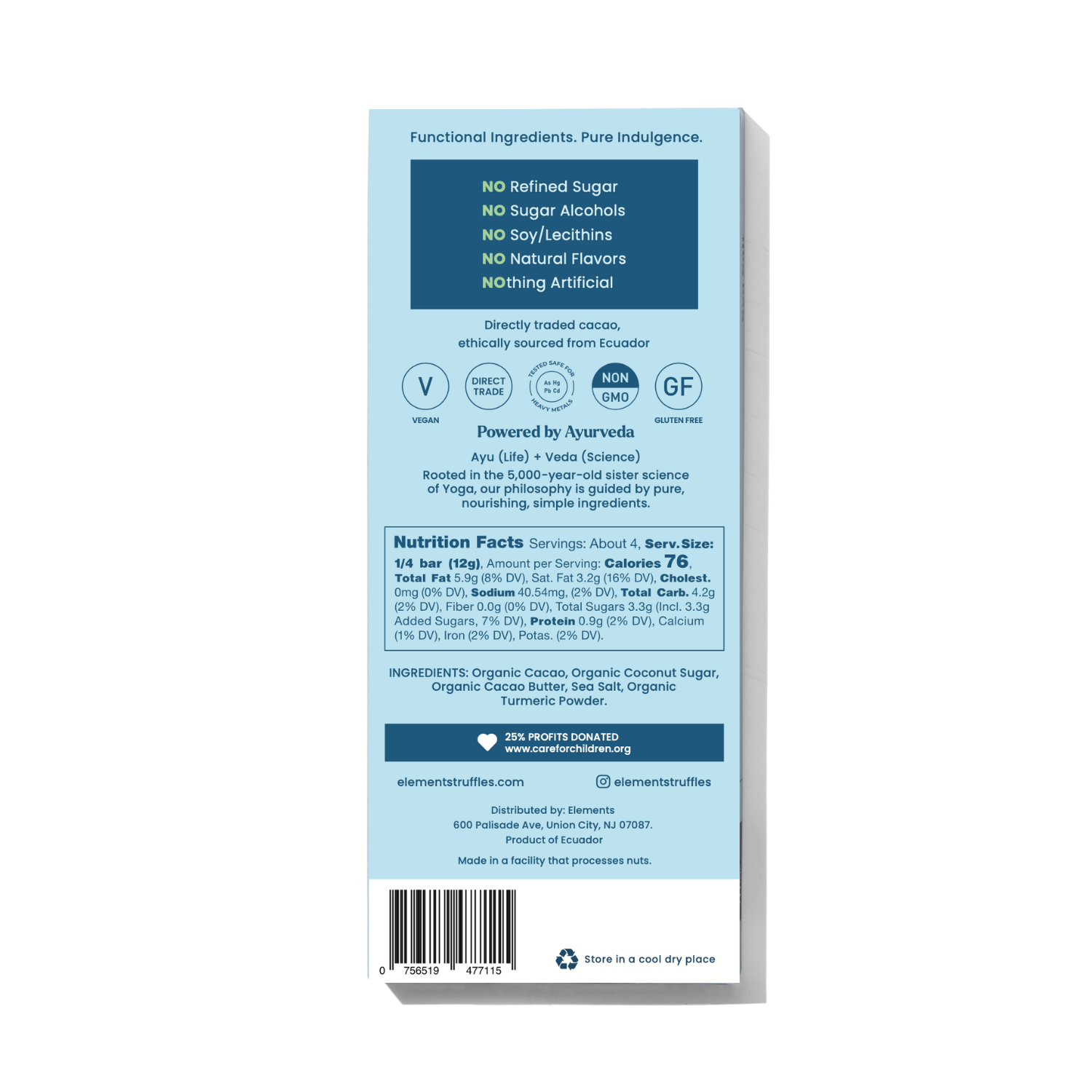 Of course, like everything else from Elements, Sea Salt bar is free from dairy, refined sugar, soy, lecithin, sugar alcohols, natural flavors, gluten or absolutely anything artificial. Think of it as a treat made from two core ingredients: Organic Cacao and Organic Coconut Sugar - the only sweetener! A pinch of Turmeric is added for the functional benefits. Sea la vie!
