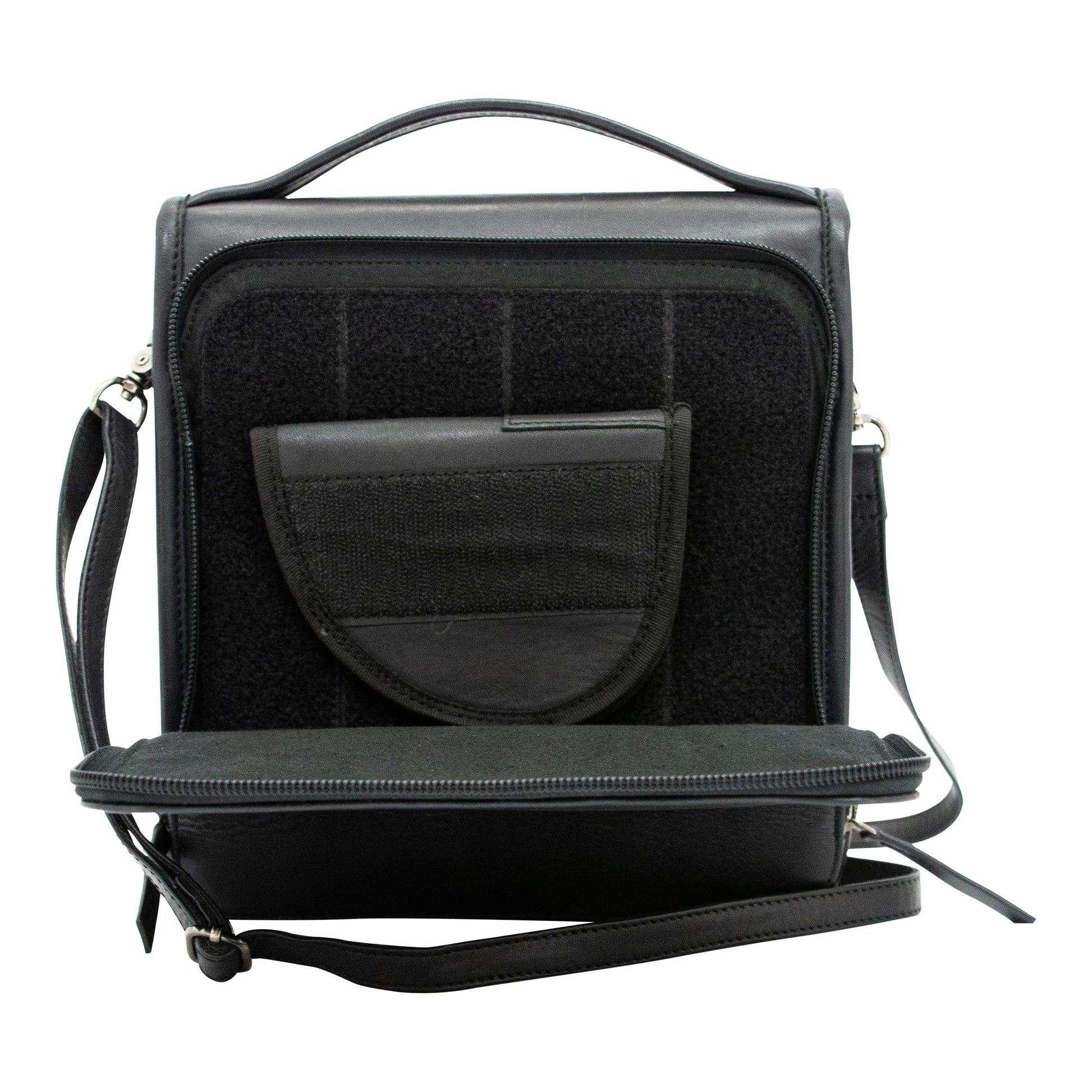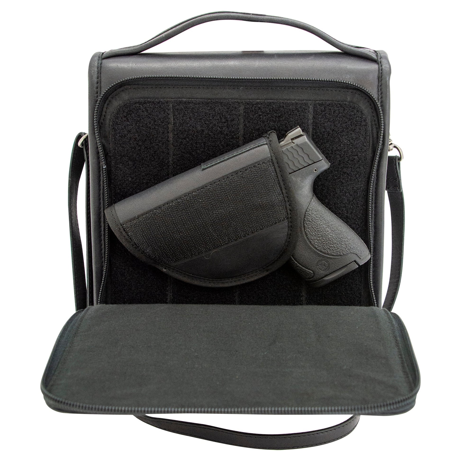 Accented with nickel-plated hardware, this compact yet roomy bag has a place for everything, including a separate, zippered holster pocket to keep your handgun safe and away from the rest of the contents of your purse. It will be safe with our included matching holster that secures to the bag using a hook and loop, which provides trigger protection and stays put should you need to draw.