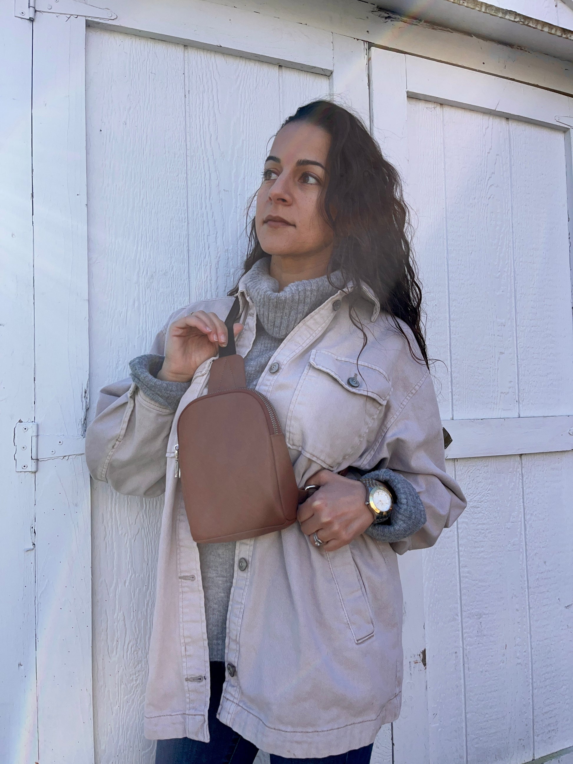This compact leather Stav sling bag offers both style and functionality with two secure zipper compartments. The main compartment features three credit card slots, a slim pocket for small essentials, and a discreet gun pocket designed to fit a small firearm. An adjustable shoulder strap with a detachable hook allows for ambidextrous use, providing comfort and versatility. Crafted from premium leather, this bag combines durability and sophistication for everyday carry needs.