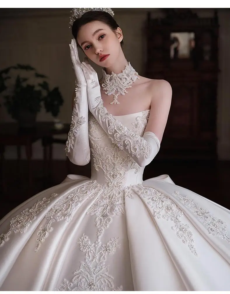 Strapless Luxurious Satin Wedding Bridal Dress Beaded Embroidery Trailing Customized