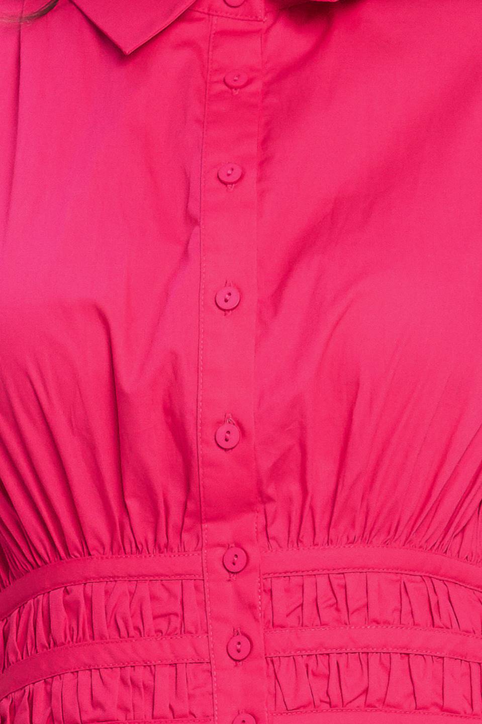 A solid woven midi dress featuring collar, short puff sleeve, front button down and tiered skirt