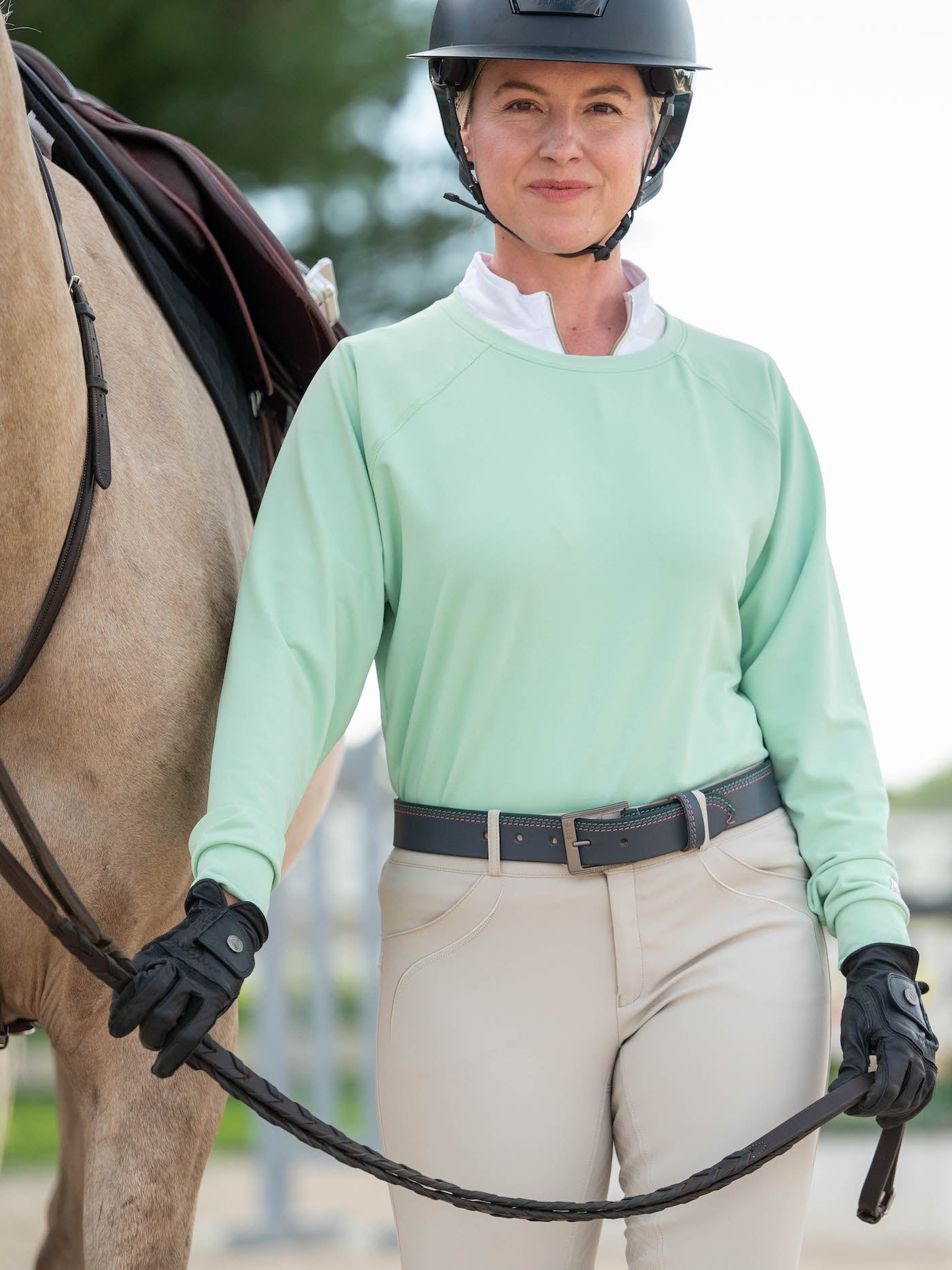 Perfect for cool mornings at the stable or long days at shows, this lightweight sweatshirt is designed to keep you comfortable without weighing you down. Wear it over your show shirt to stay polished while you prep, keep it on for schooling, or tuck it in for a jumper round — it’s as versatile as your riding day demands.
