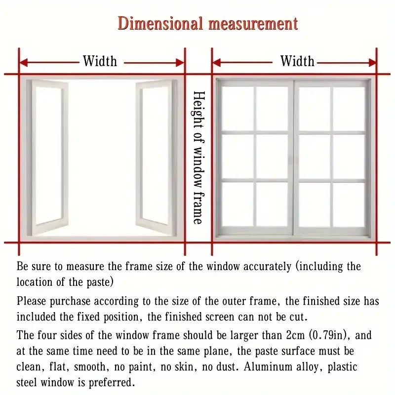 When the window screen is folded and transported, some wrinkles may form during transportation. However, after a few days of installation and use, these wrinkles will gradually disappear, allowing you to use the window screen with peace of mind. The window screen has been pre packaged and cannot be cut. Please choose the size based on your window frame, there may be an error of 1-2 centimeters (0.39-0.78 inches).