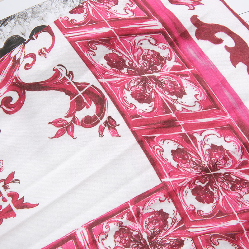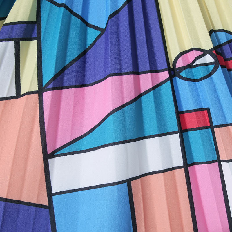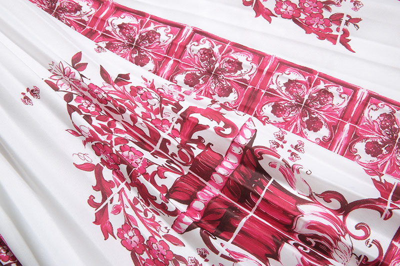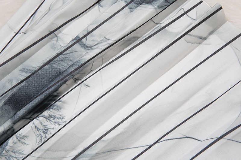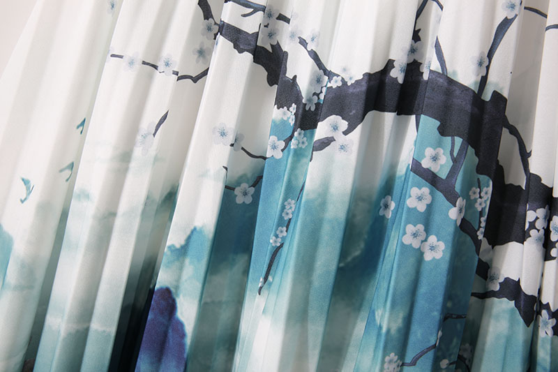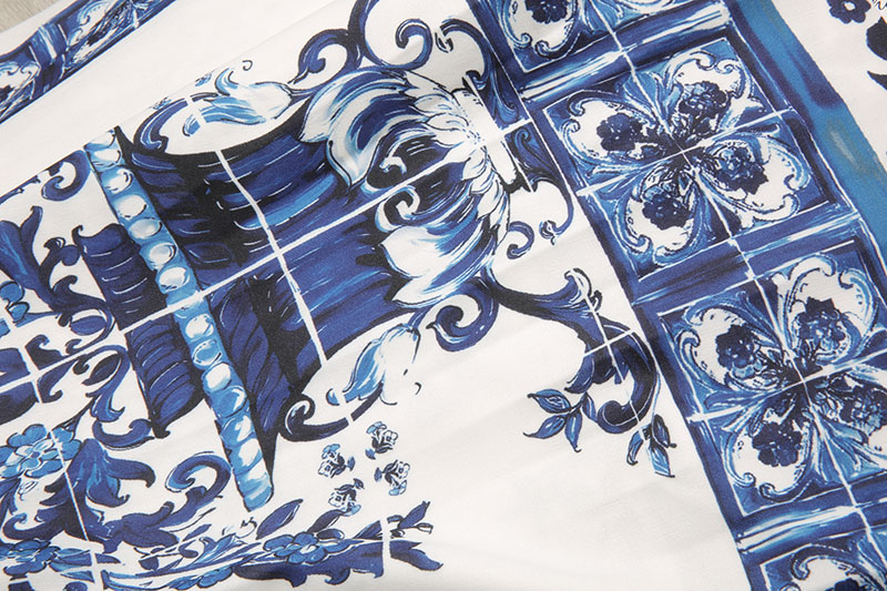 Summer Retro Blue and White Porcelain Printed Mid Length Pleated Skirt