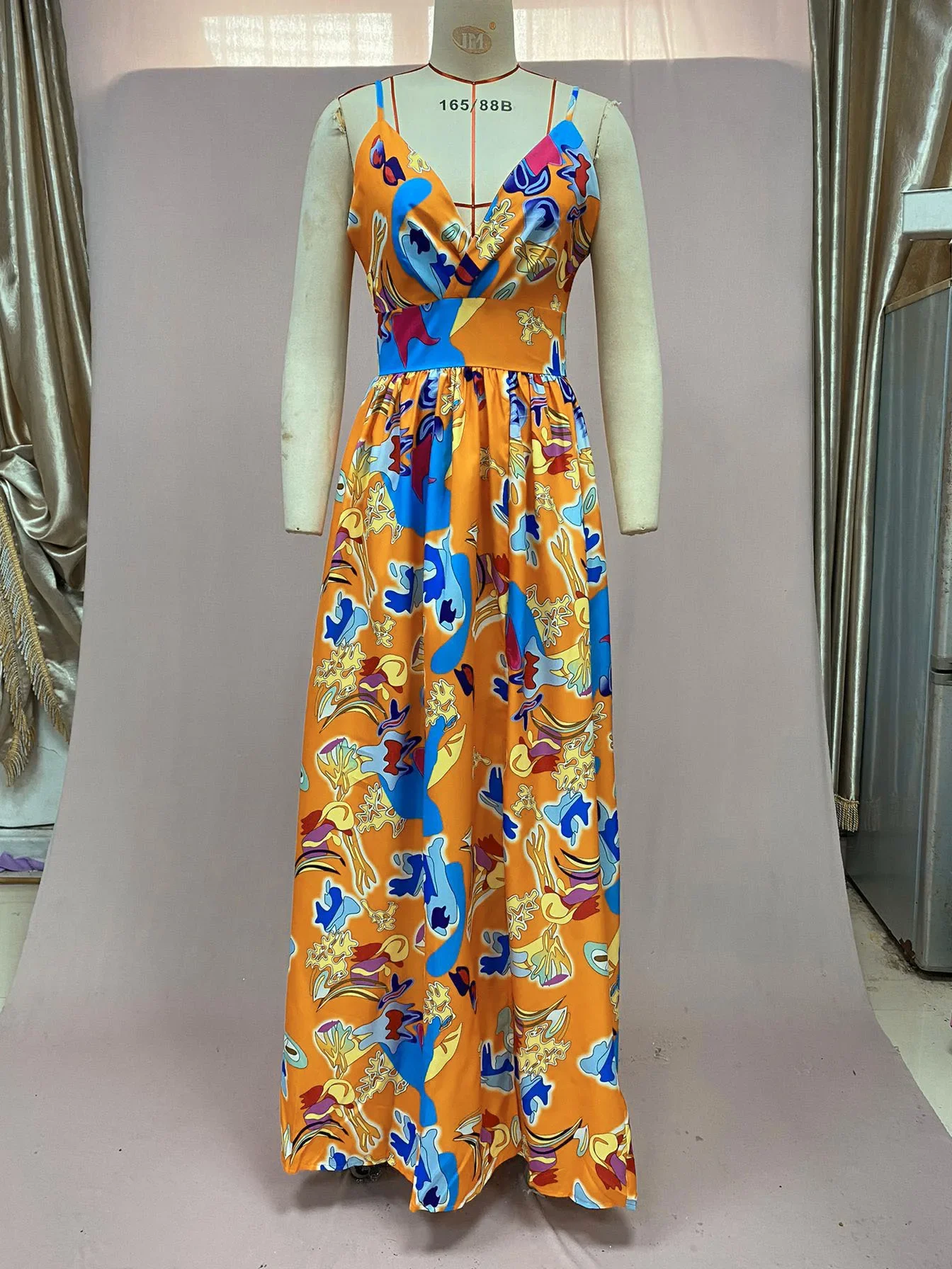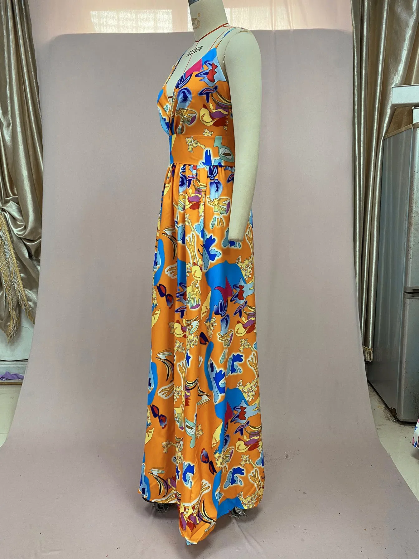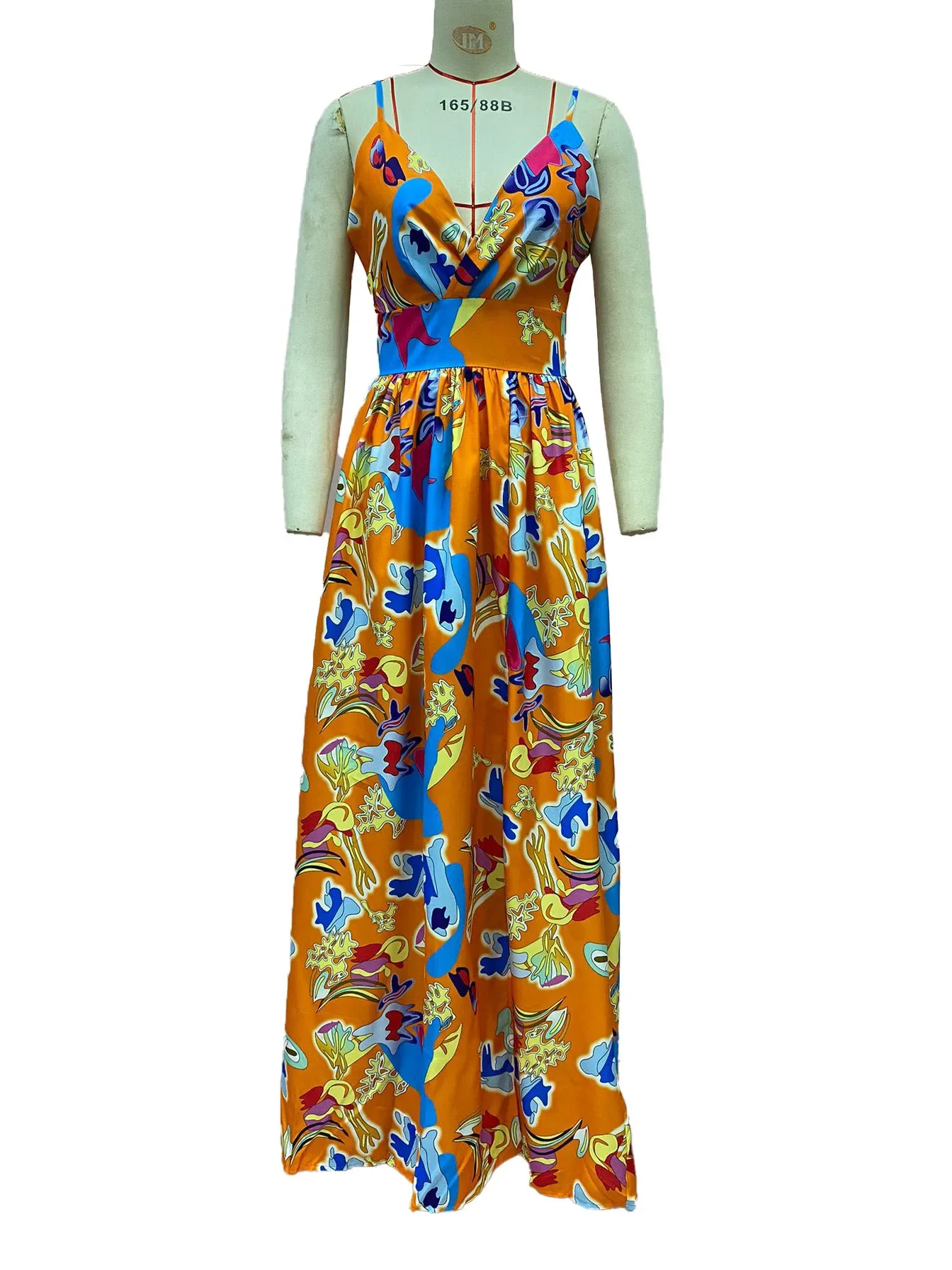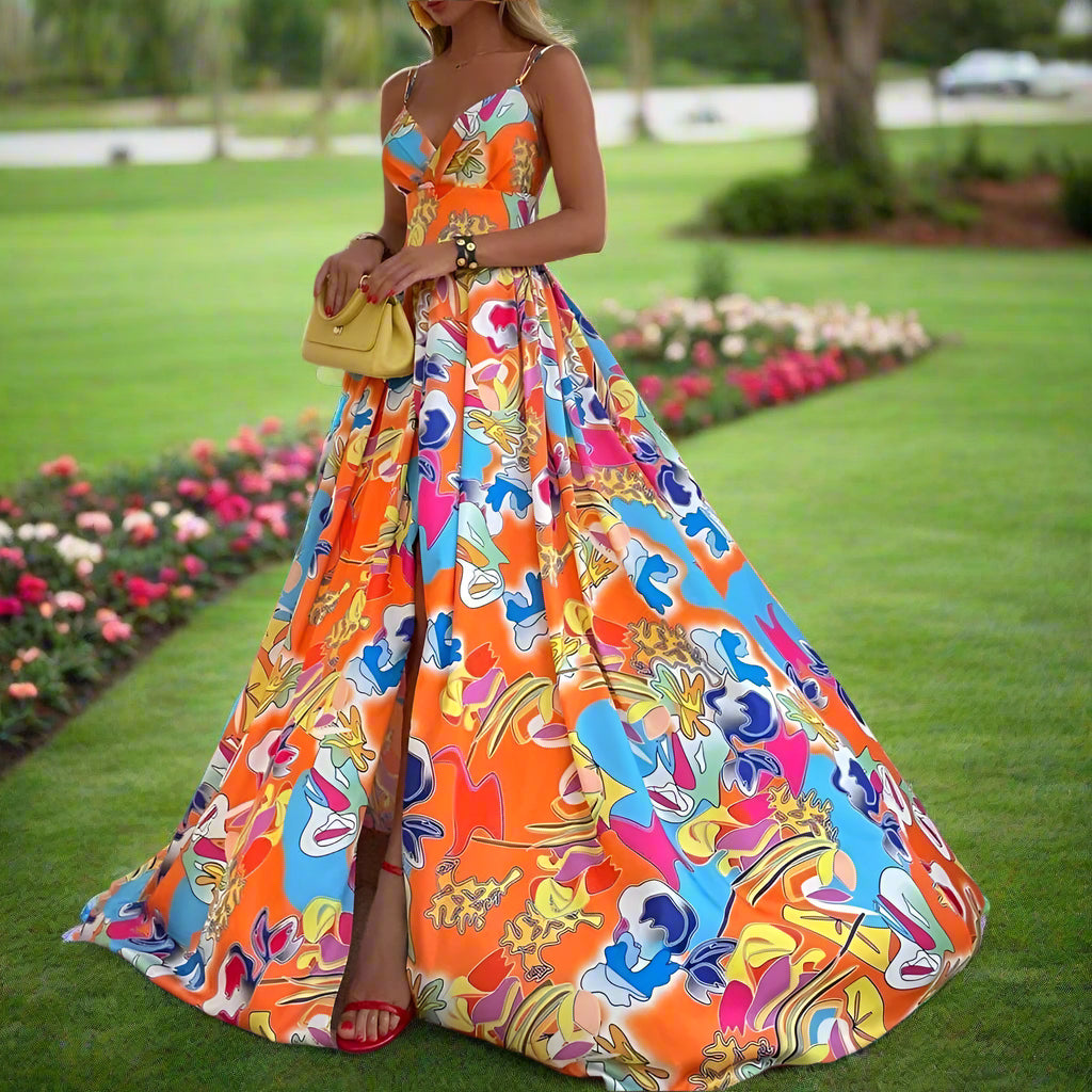 This summer dress for women features a flowing chiffon fabric with a vibrant bohemian print, perfect for vacation or warm-weather occasions. Its sleeveless design and V-neckline enhance comfort and style, while the tiered, floor-length silhouette adds an elegant, breezy touch to your summer wardrobe.