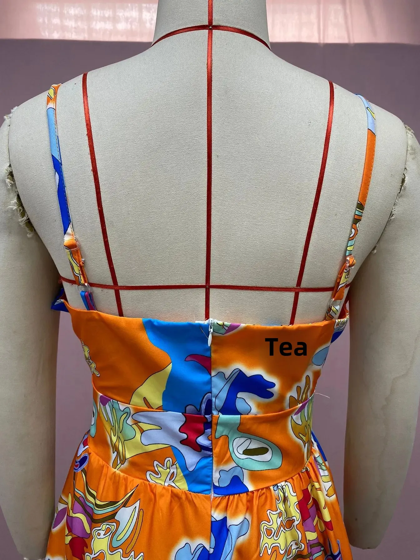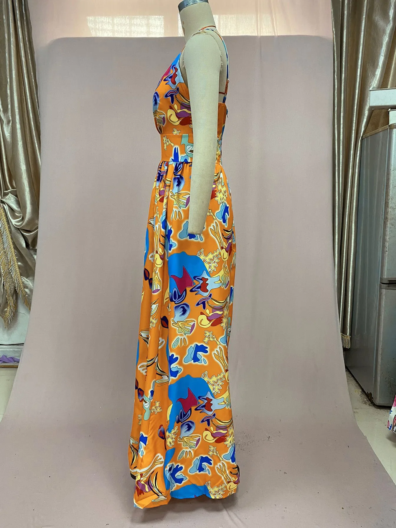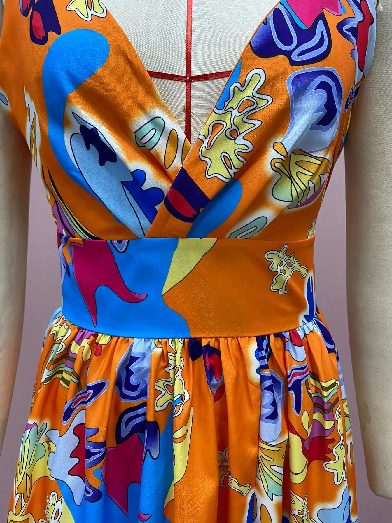 This summer dress for women features a flowing chiffon fabric with a vibrant bohemian print, perfect for vacation or warm-weather occasions. Its sleeveless design and V-neckline enhance comfort and style, while the tiered, floor-length silhouette adds an elegant, breezy touch to your summer wardrobe.