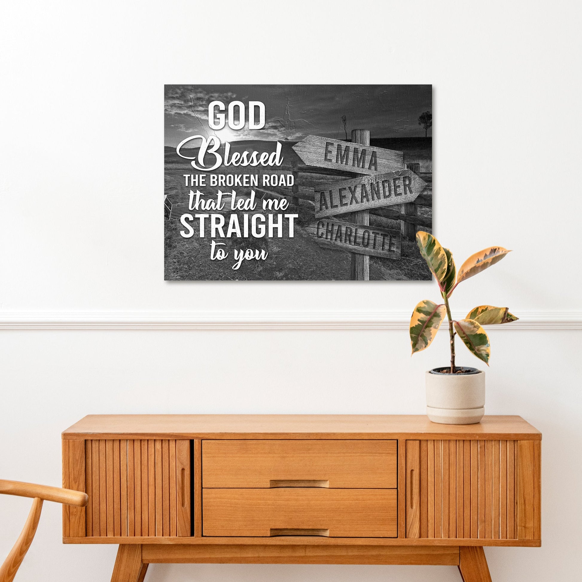 You can customize the Family Names canvas print with your choice of words and names, as well as the image you want in the background. The fonts used and the color scheme are also customizable, so you can have something entirely different.