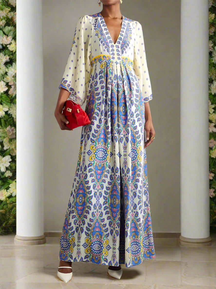 Three Quarter Sleeve Patchwork Loose Chic Maxi Women V Neck Dress