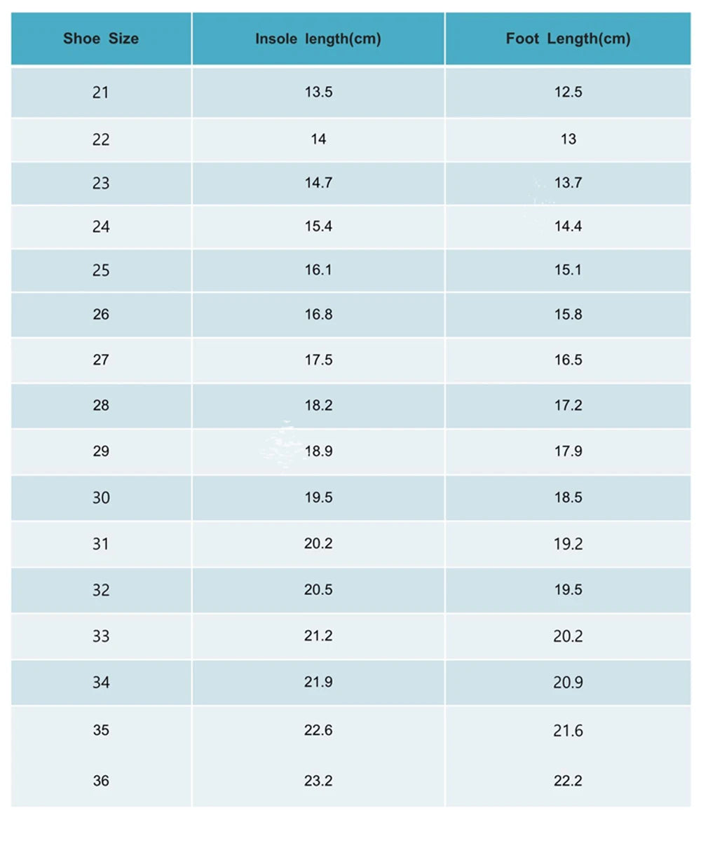 Shoes Length: 13.5cm,14cm,14.5cm,15cm,16cm,17cm,17.5cm,18cm,18.5cm,19cm,19.5cm,20cm,20.5cm,21cm,21.5cm,22cm,22.5cm,23cm