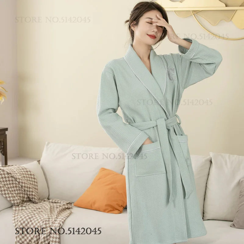Waffle 100% Cotton Sleepwear Hotel Embroidery Kimono Bathrobe Gown