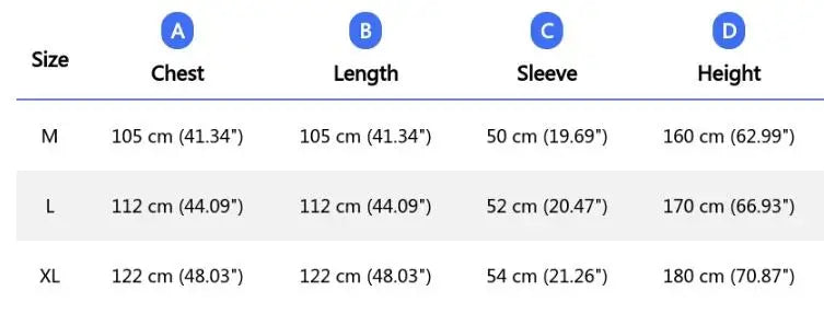 Size XL: Chest 122 cm (48.03''), Length 122 cm (48.03''), Sleeve 54 cm (21.26''), Height 180 cm (70.87'')