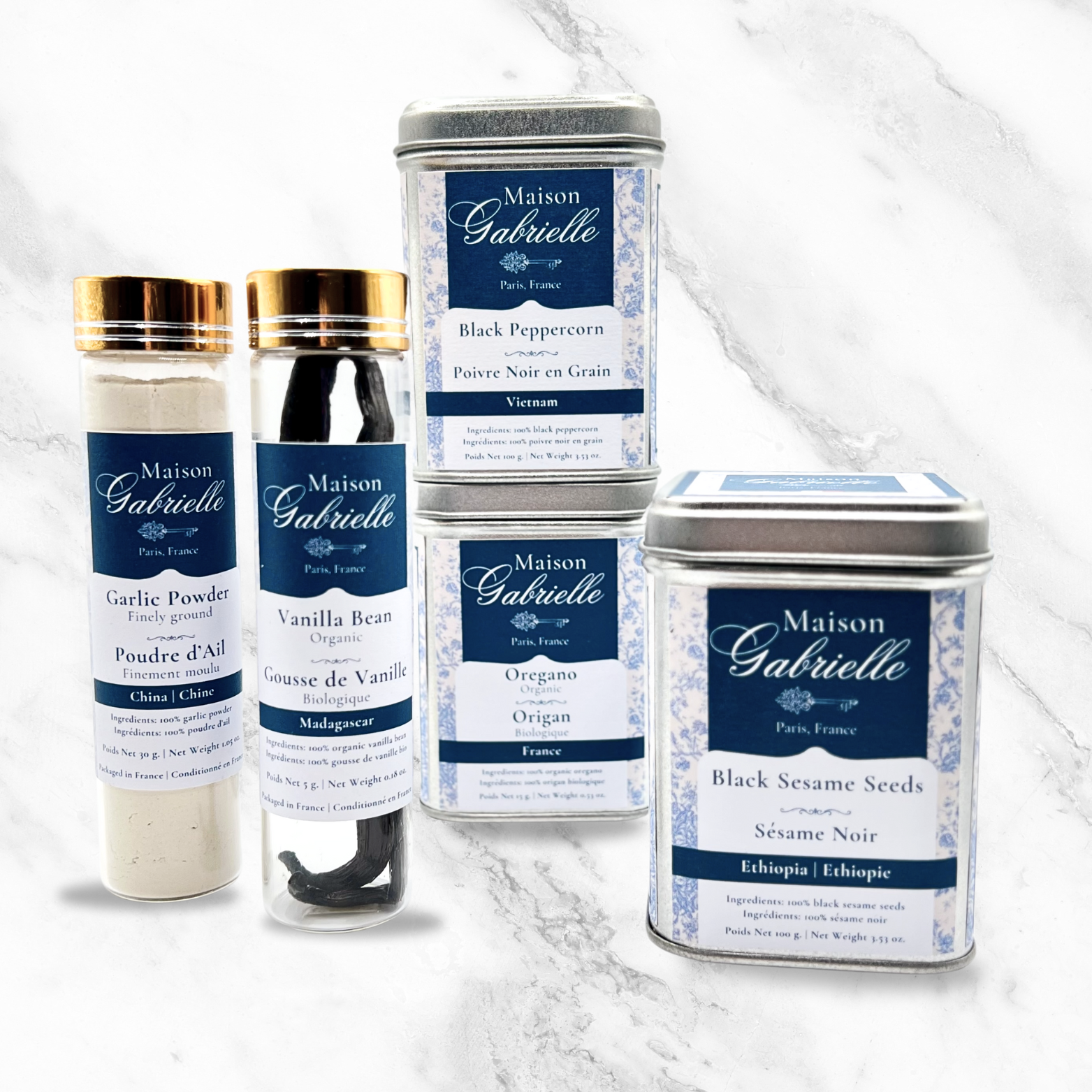 The Maison Gabrielle Winter Spice Box is a luxurious, limited-edition collection of hand-picked spices—Vanilla Bean, Black Peppercorn, Dried Oregano, Garlic Powder, and Black Sesame Seeds—crafted to elevate your holiday feasts. With premium flavors and exclusive recipes, it transforms your meals into unforgettable gourmet experiences. Celebrate the season with Maison Gabrielle's signature blend of elegance and taste.