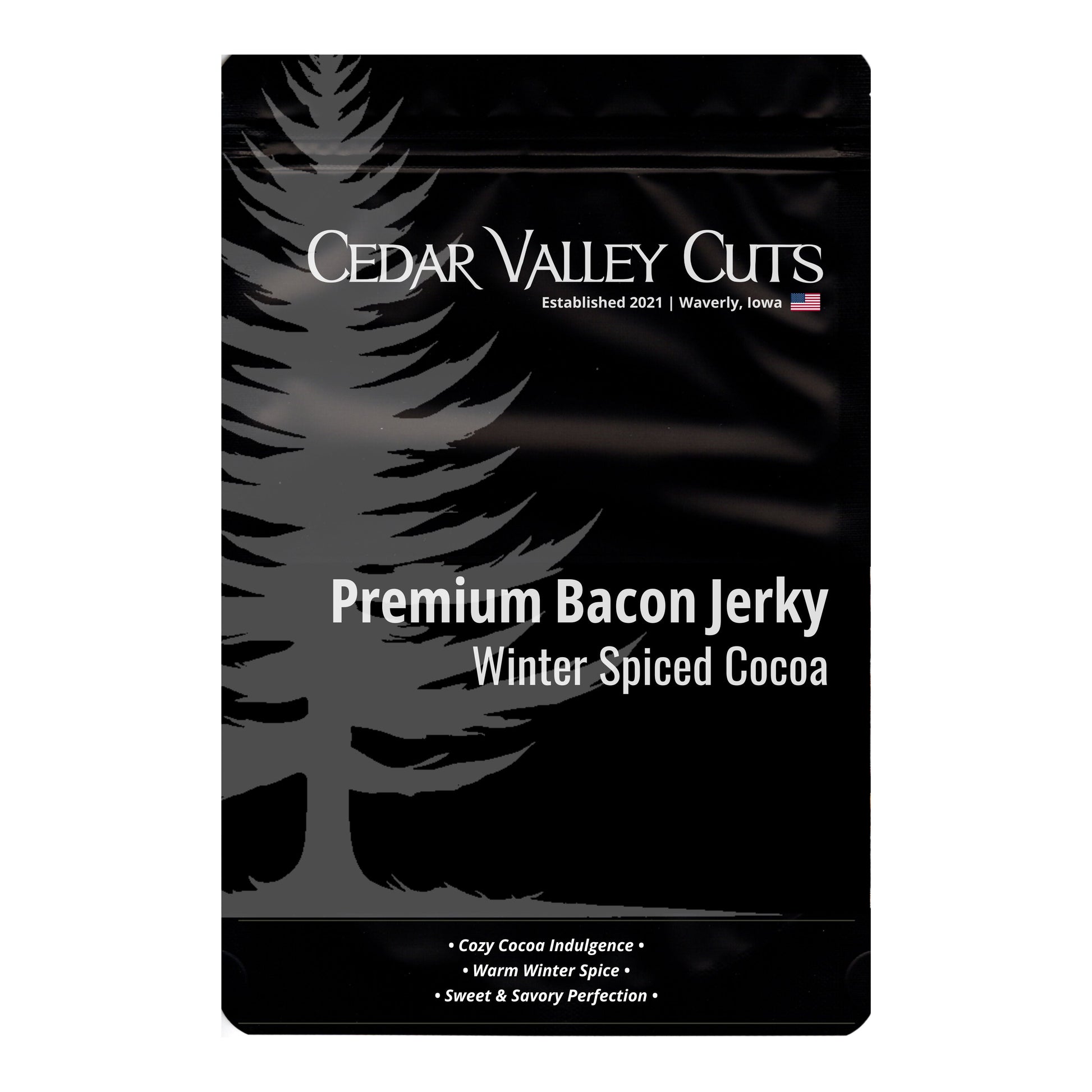 Indulge in the cozy magic of winter with Cedar Valley Cuts Premium Bacon Jerky: Winter Spiced Cocoa — a rich, decadent twist on our beloved thick-cut bacon jerky, crafted to capture the comforting essence of the season.