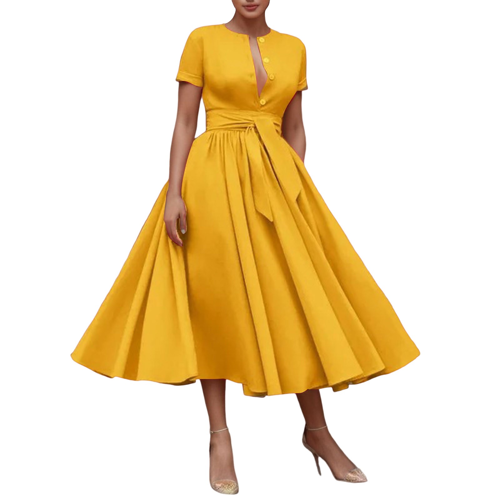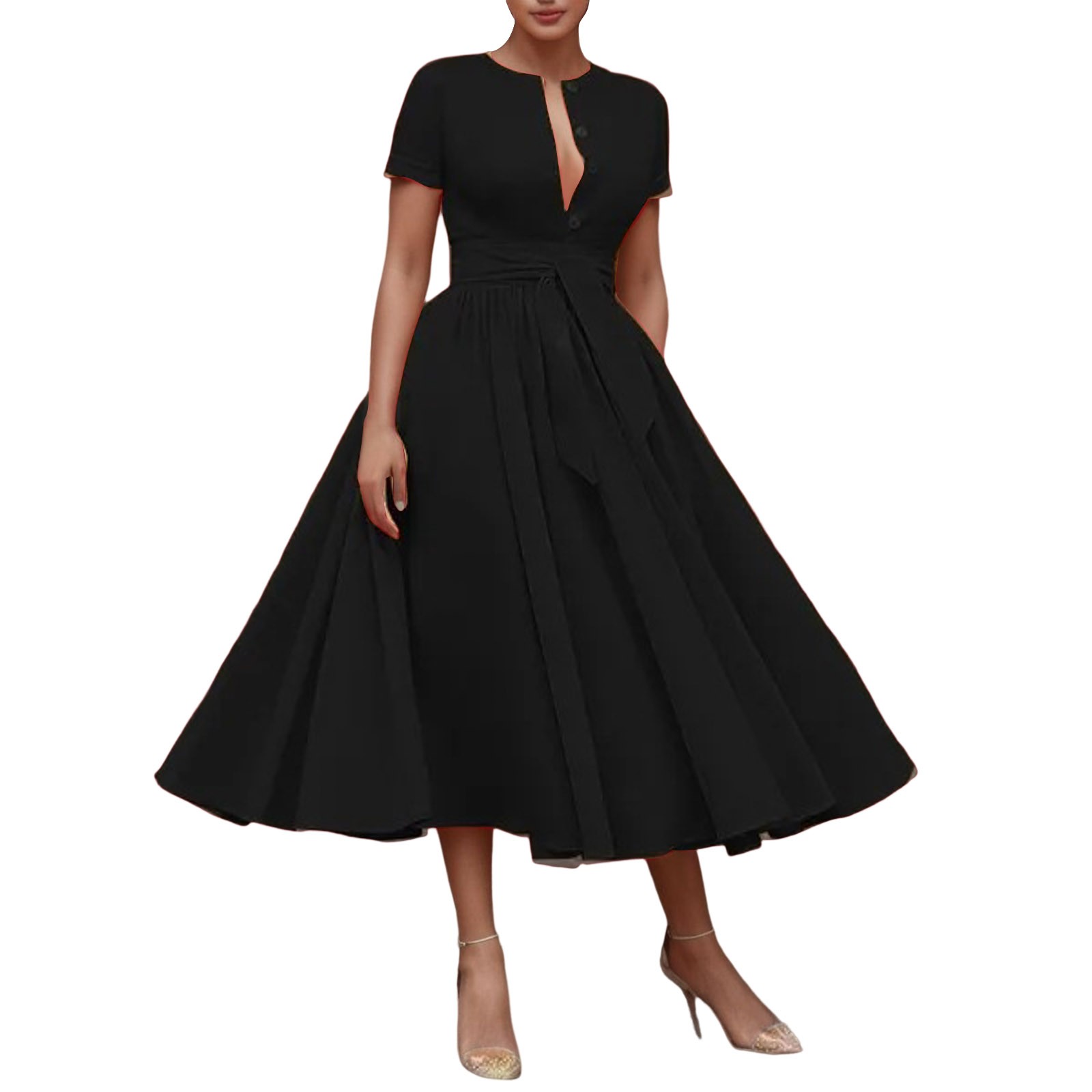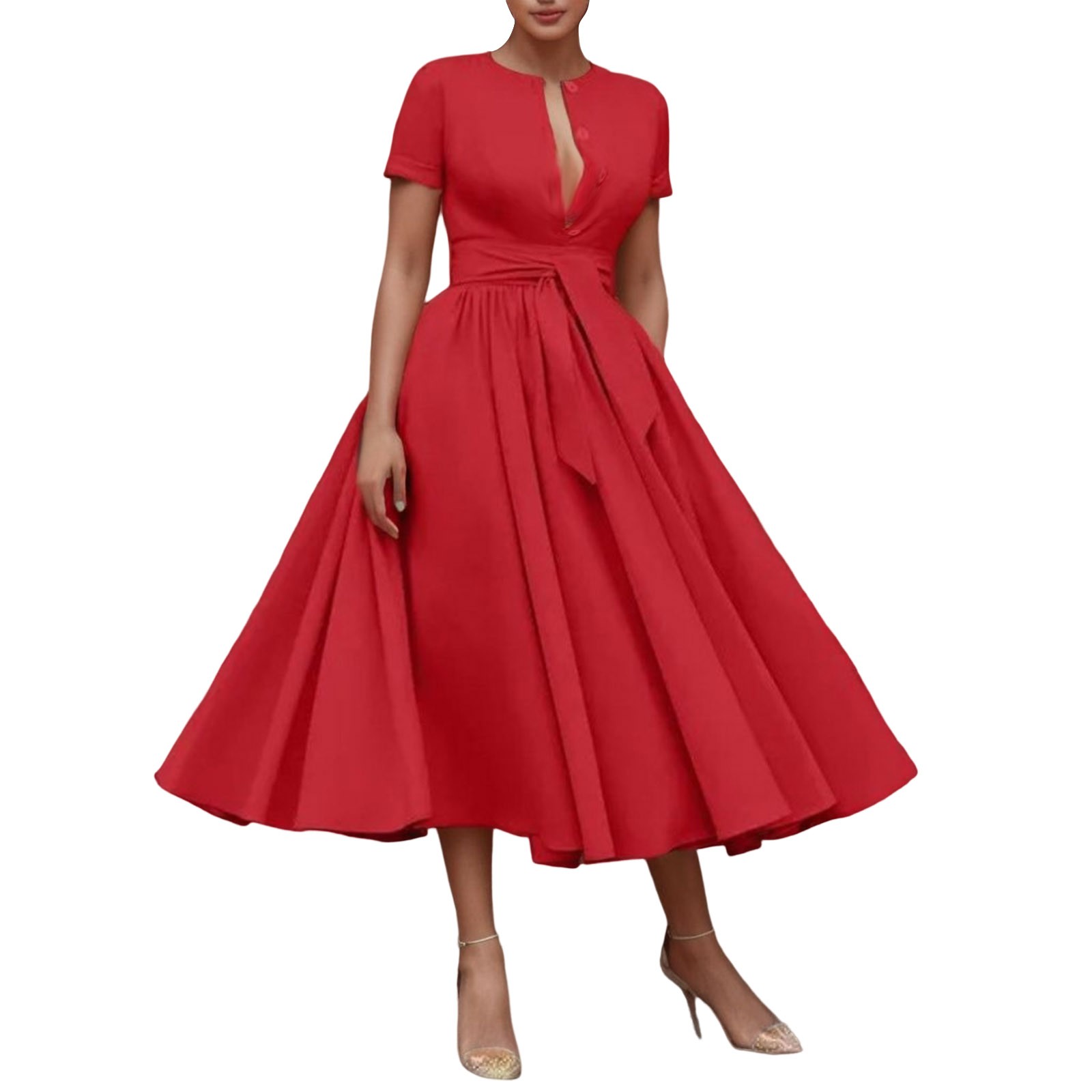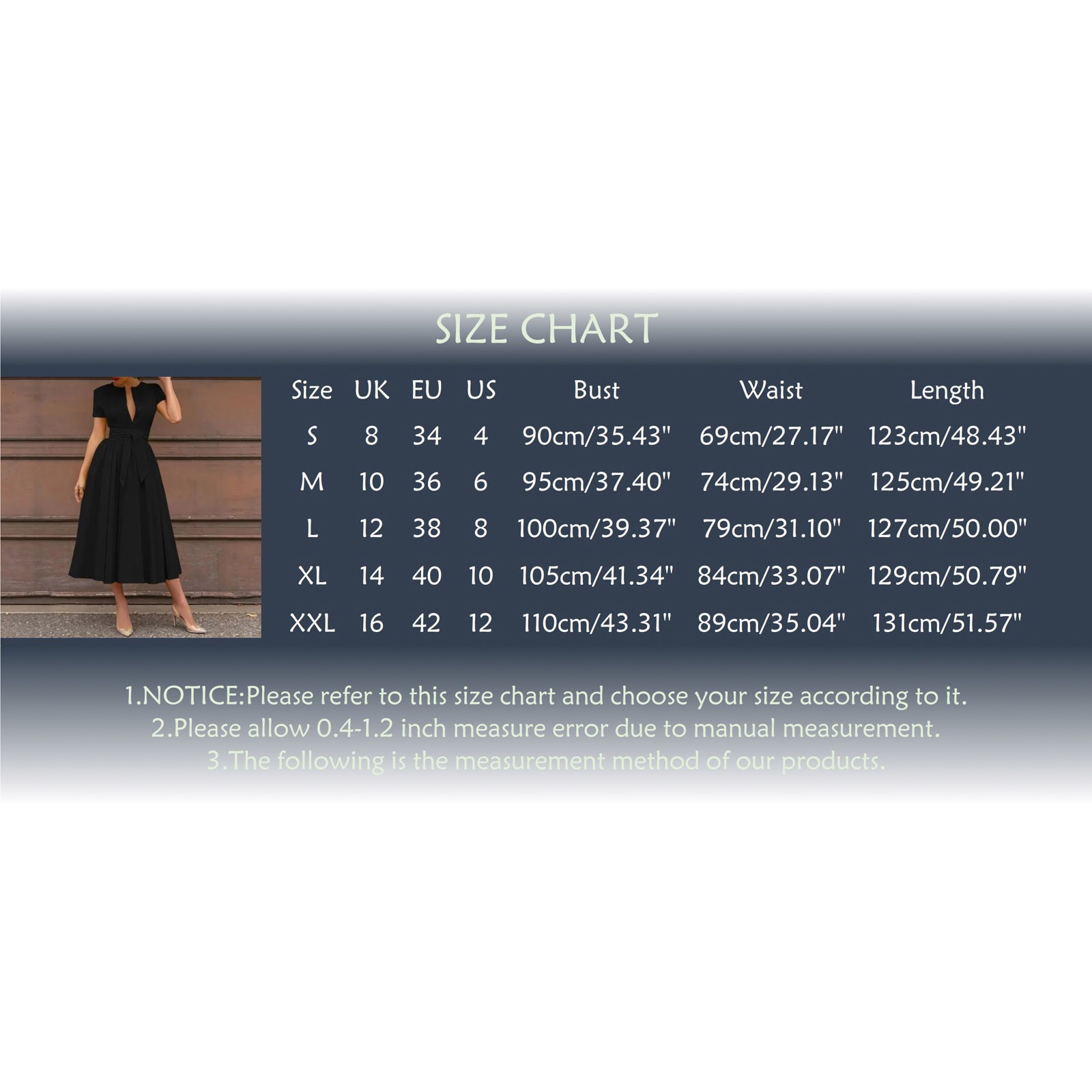 Women Elegant Formal Party Evening Dress Short Sleeve Sashes Mid-Calf Dress