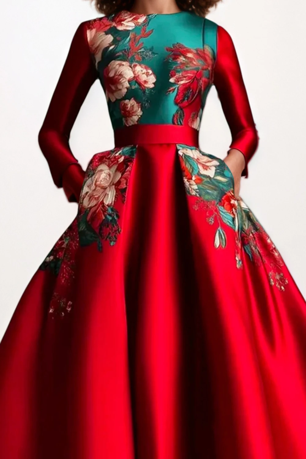 Women Elegant Satin A-Line Long Sleeve Round Neck Floral Printed Pockets Dress