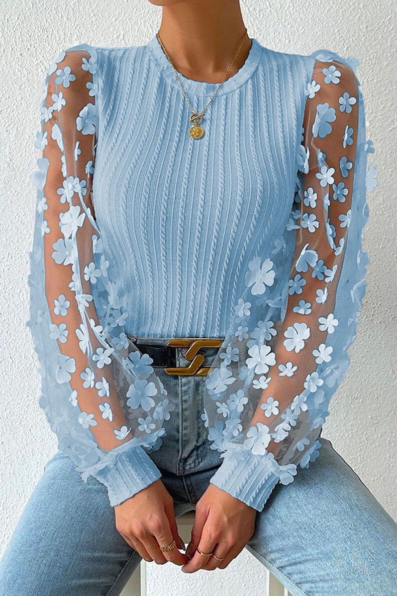 Women Fashion Blouse Mesh Long Sleeves Small Flower