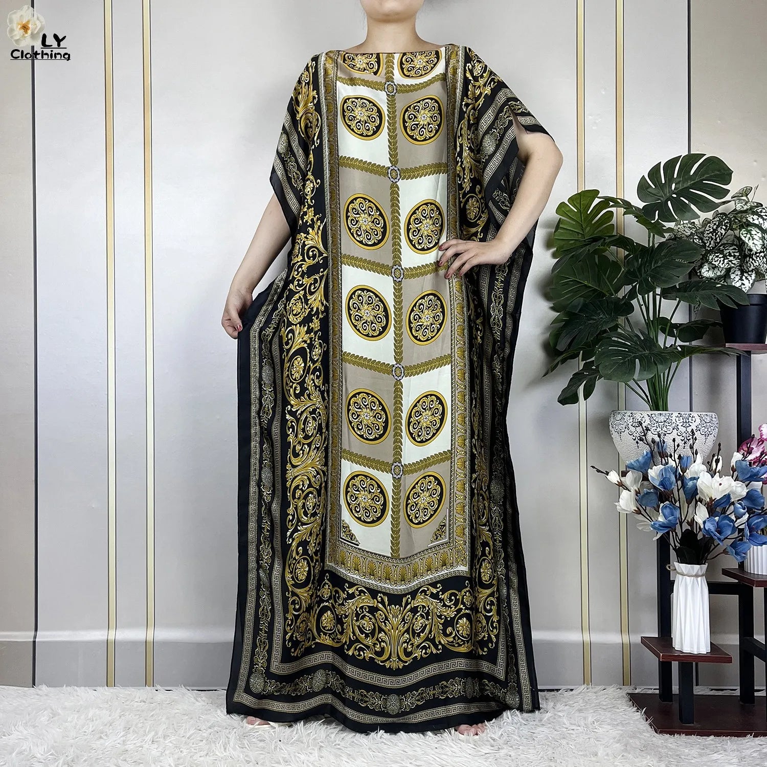 Women Printed Silk Soft Loose Maxi Party Dresses With Belt Turban