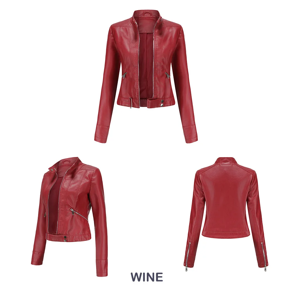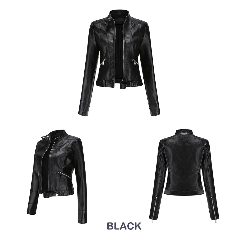 Women PU Leather Short Jacket With Belt Stand-up Collar Zipper Biker Coat