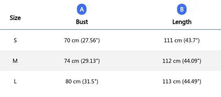Size L: Bust 80 cm (31.5''), Length 113 cm (44.49'')