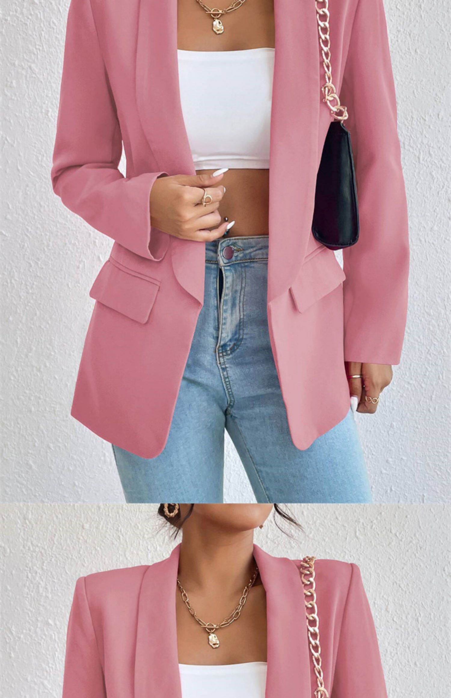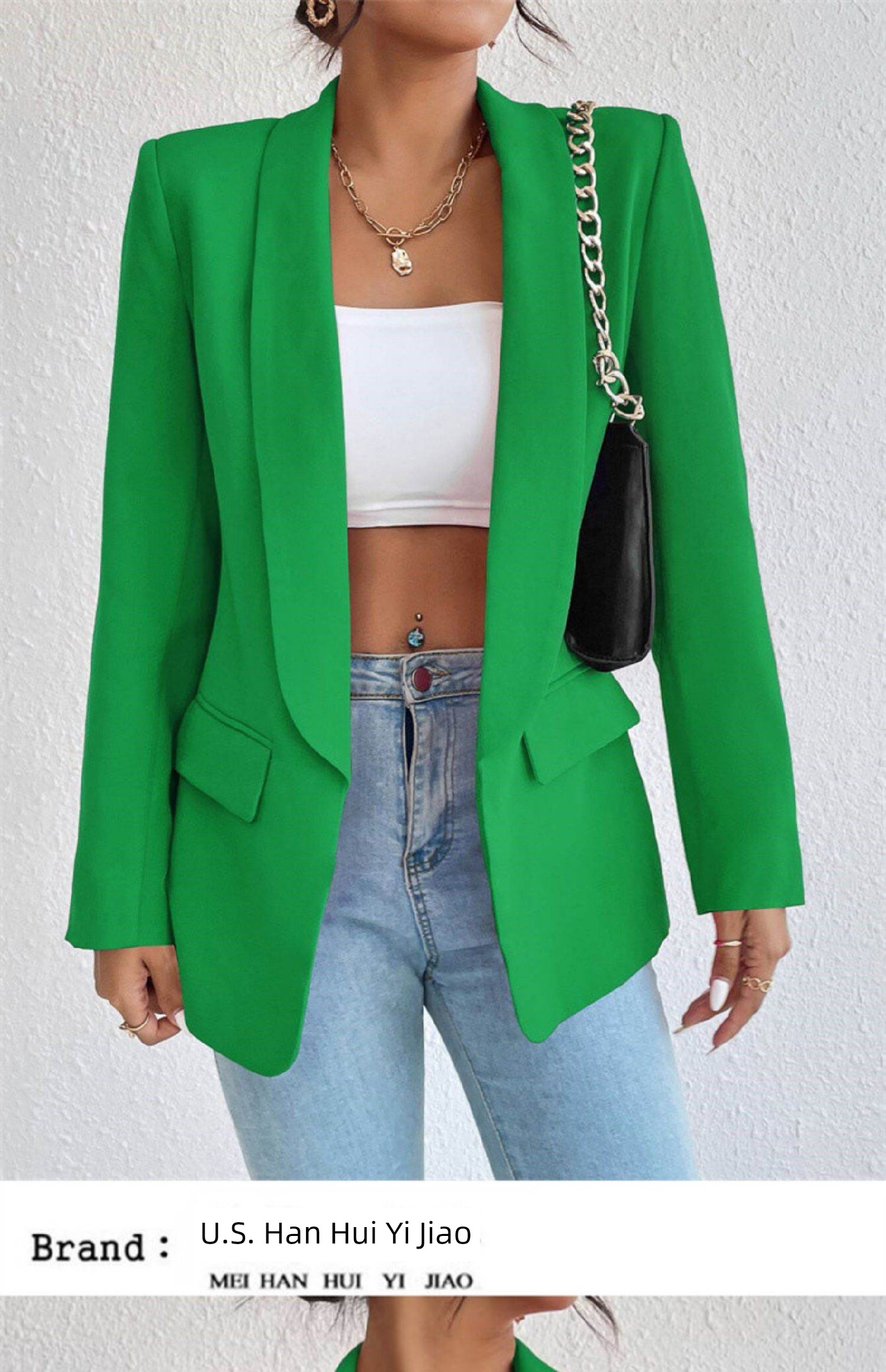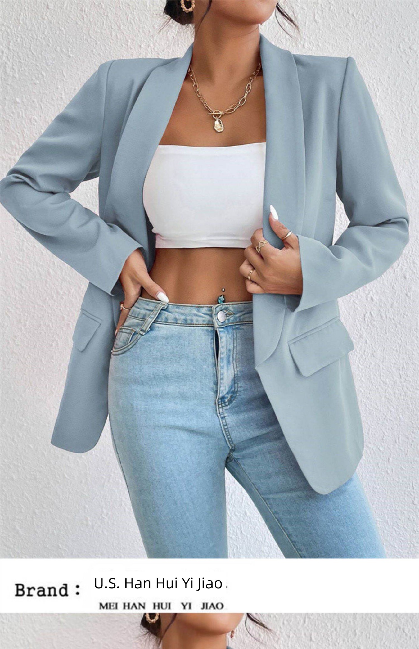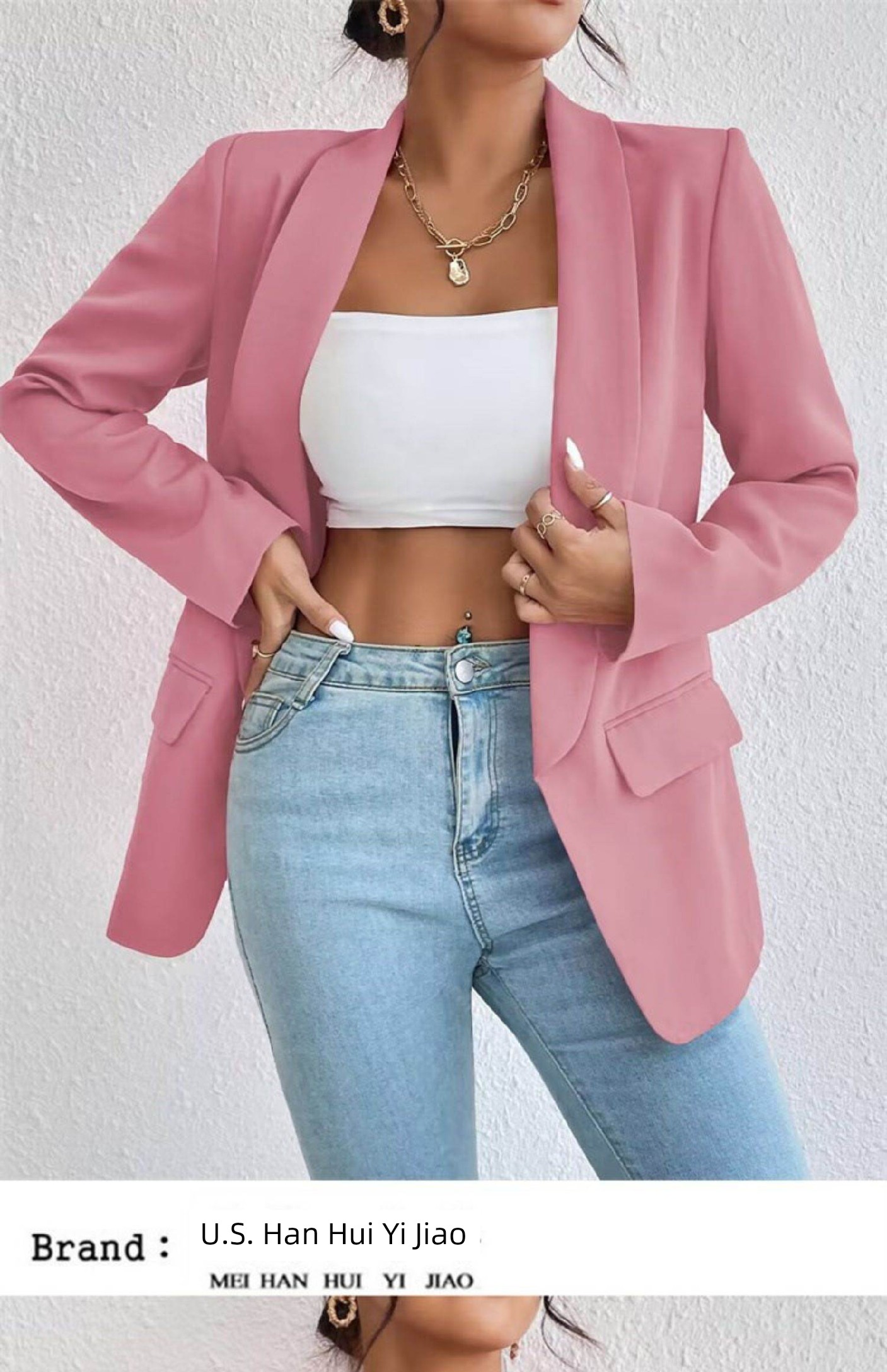 This women's blazer jacket features a classic suit collar and is crafted from polyester for durability and comfort. Designed with long sleeves and a solid color pattern, it offers a sleek street style perfect for spring. This versatile blazer is an ideal addition to your wardrobe for a polished, contemporary look.