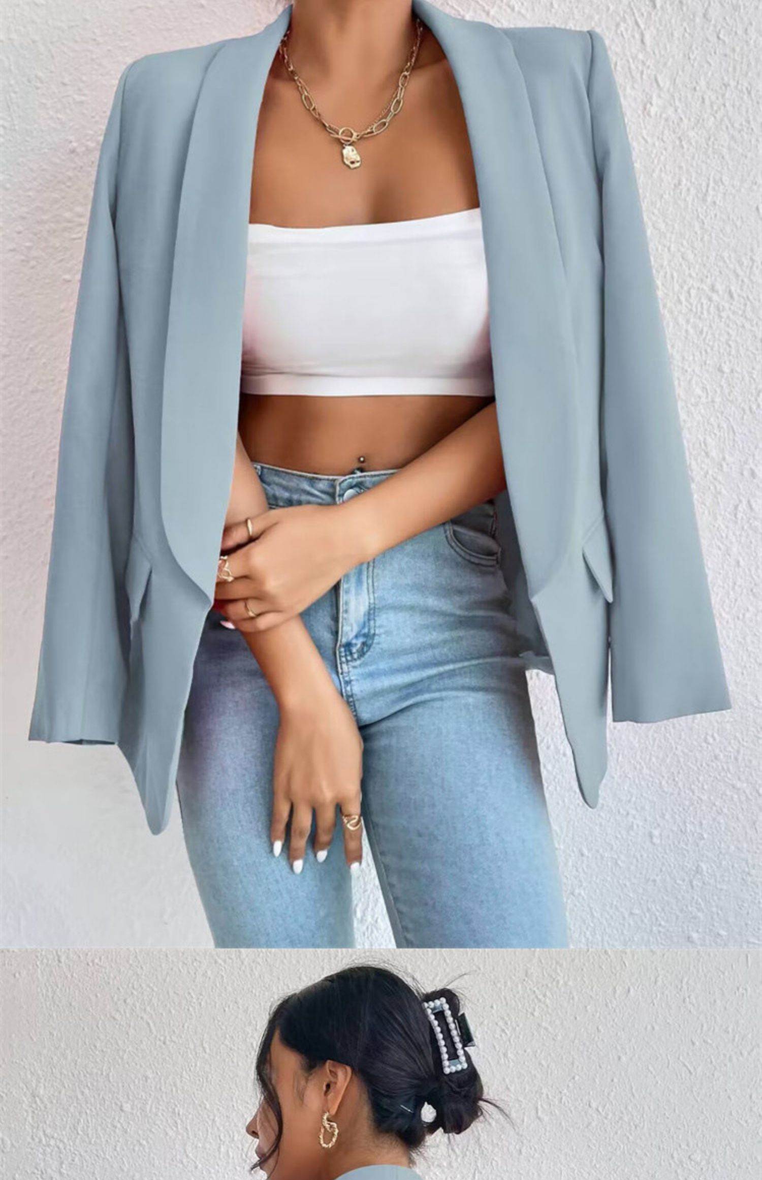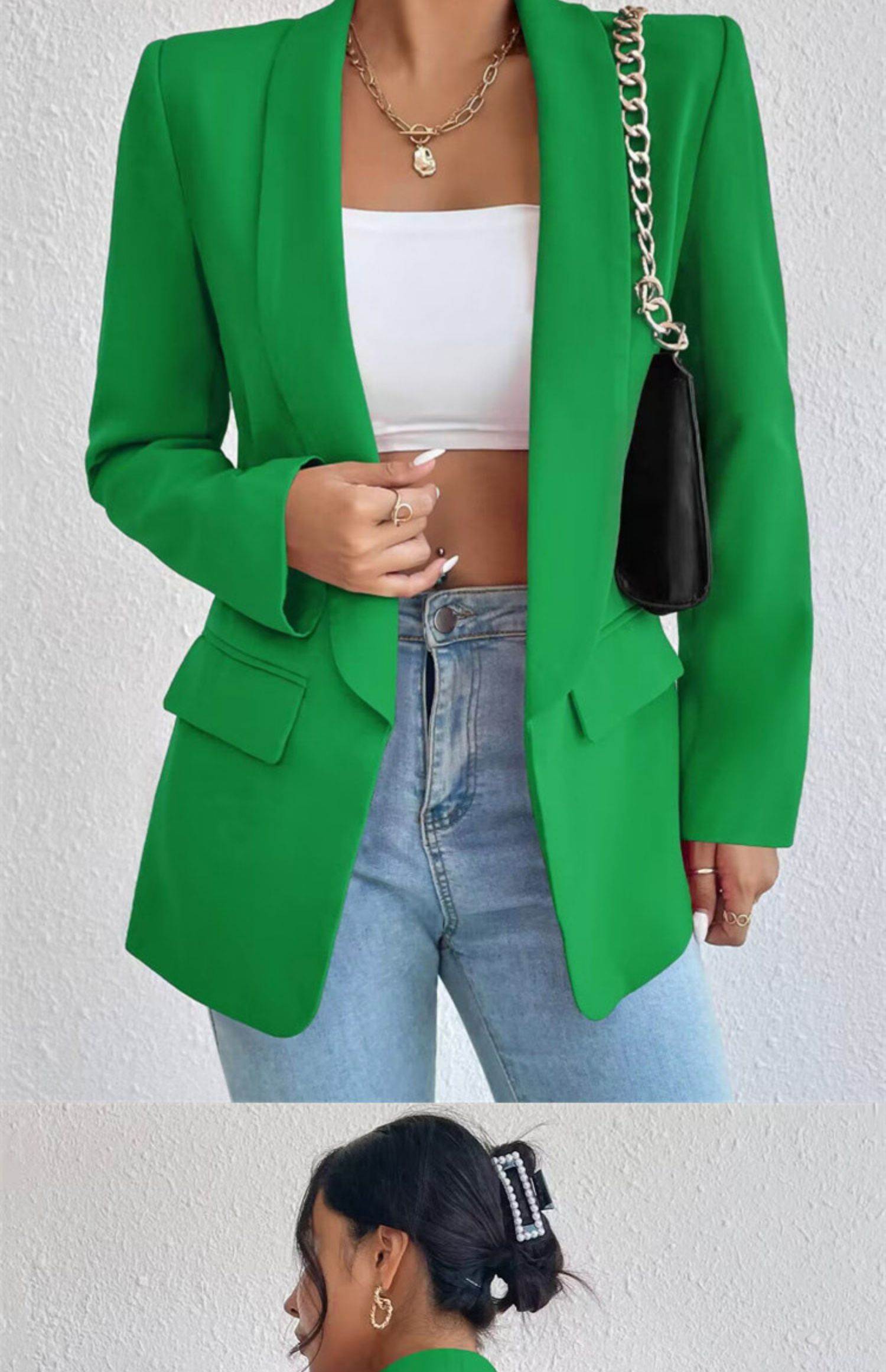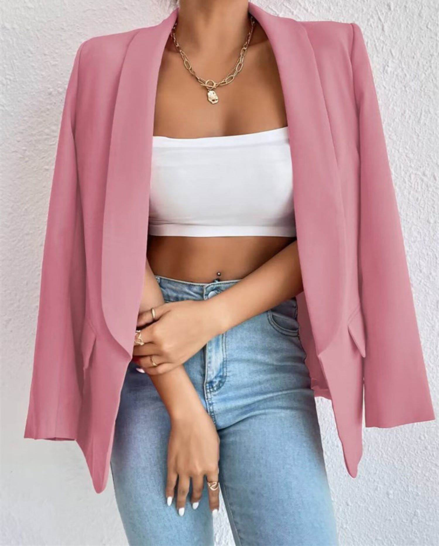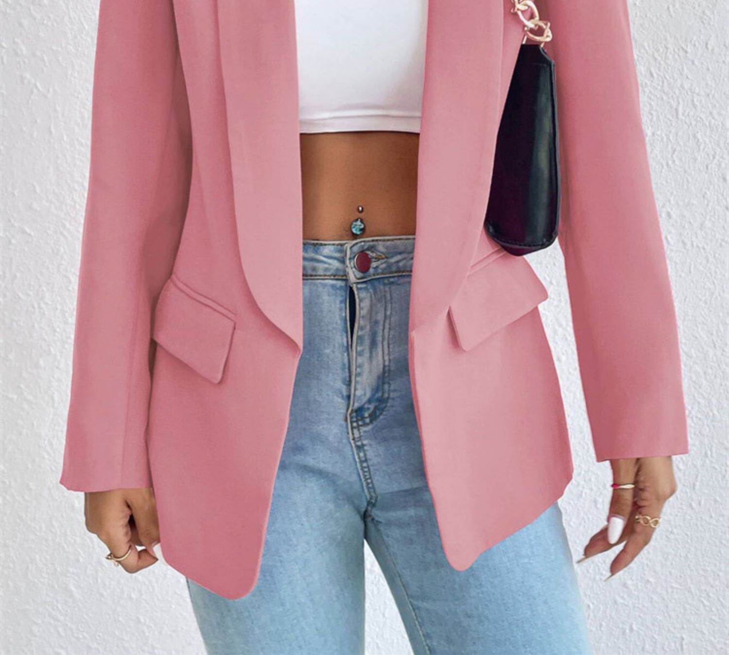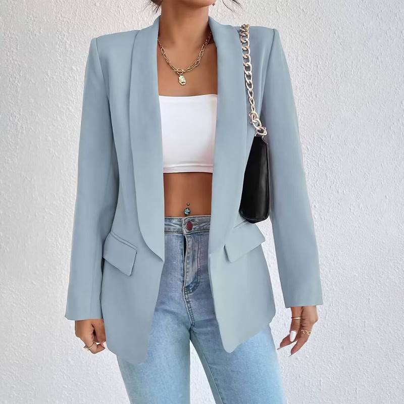 This women's blazer jacket features a classic suit collar and is crafted from polyester for durability and comfort. Designed with long sleeves and a solid color pattern, it offers a sleek street style perfect for spring. This versatile blazer is an ideal addition to your wardrobe for a polished, contemporary look.