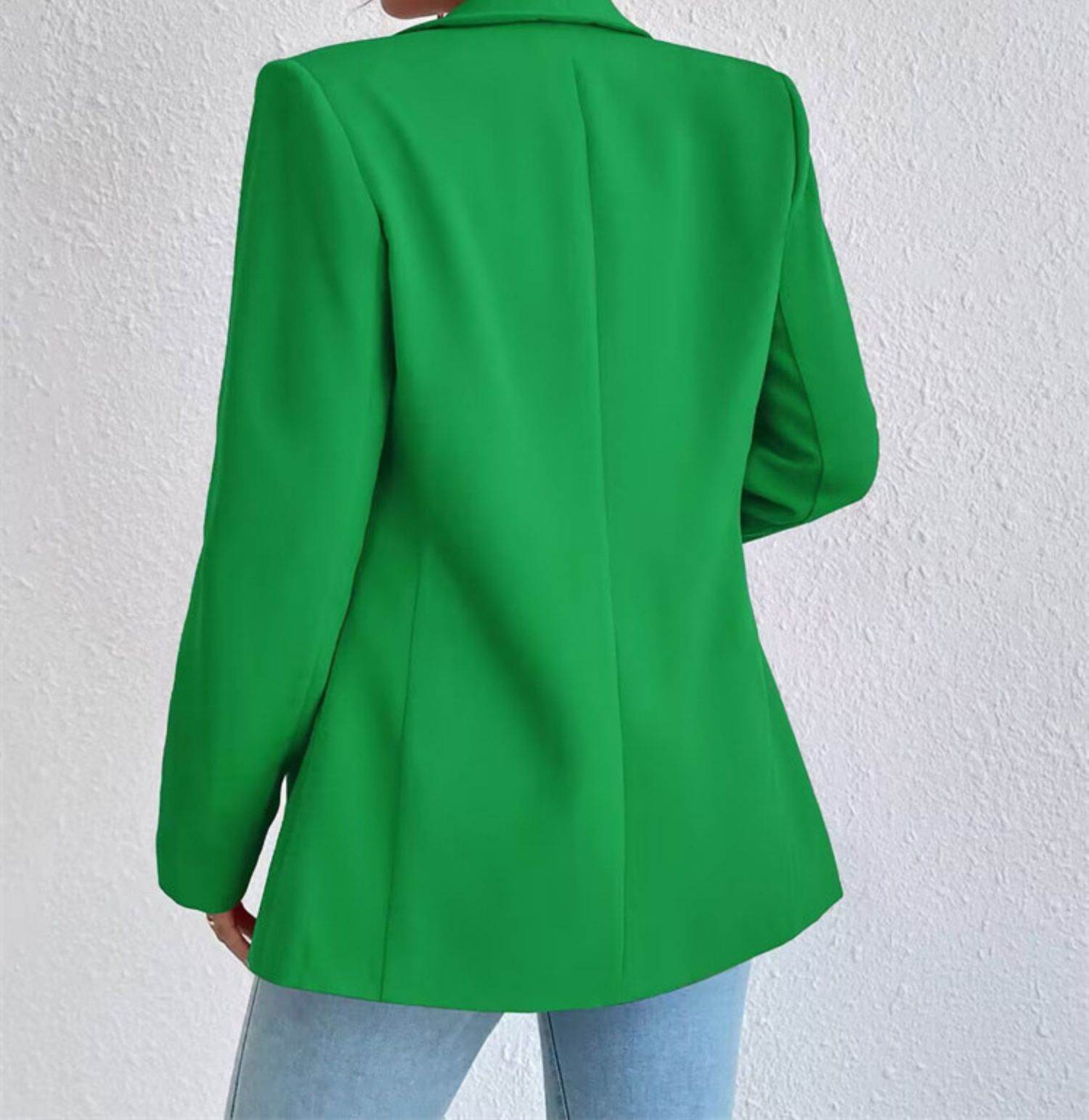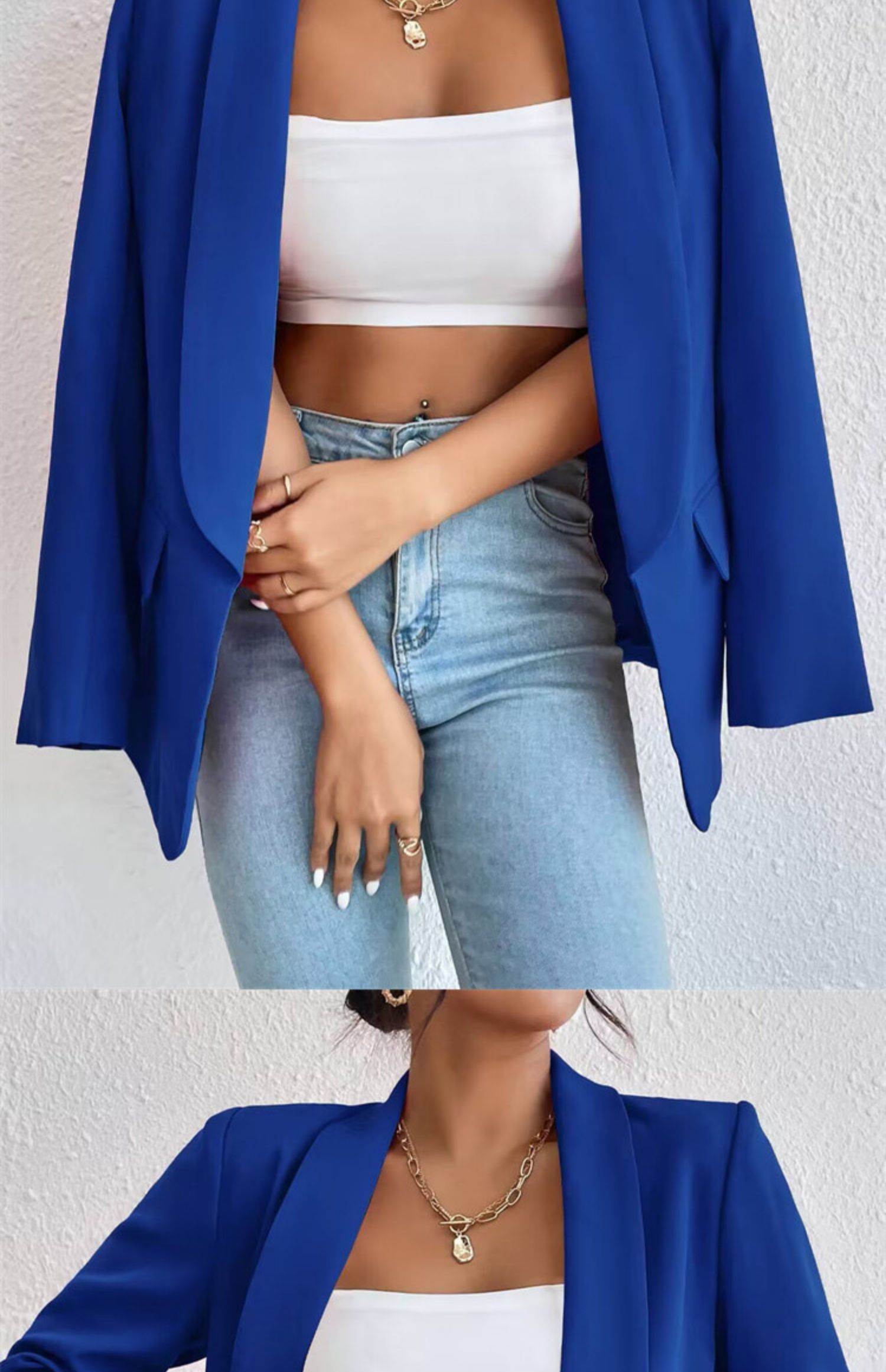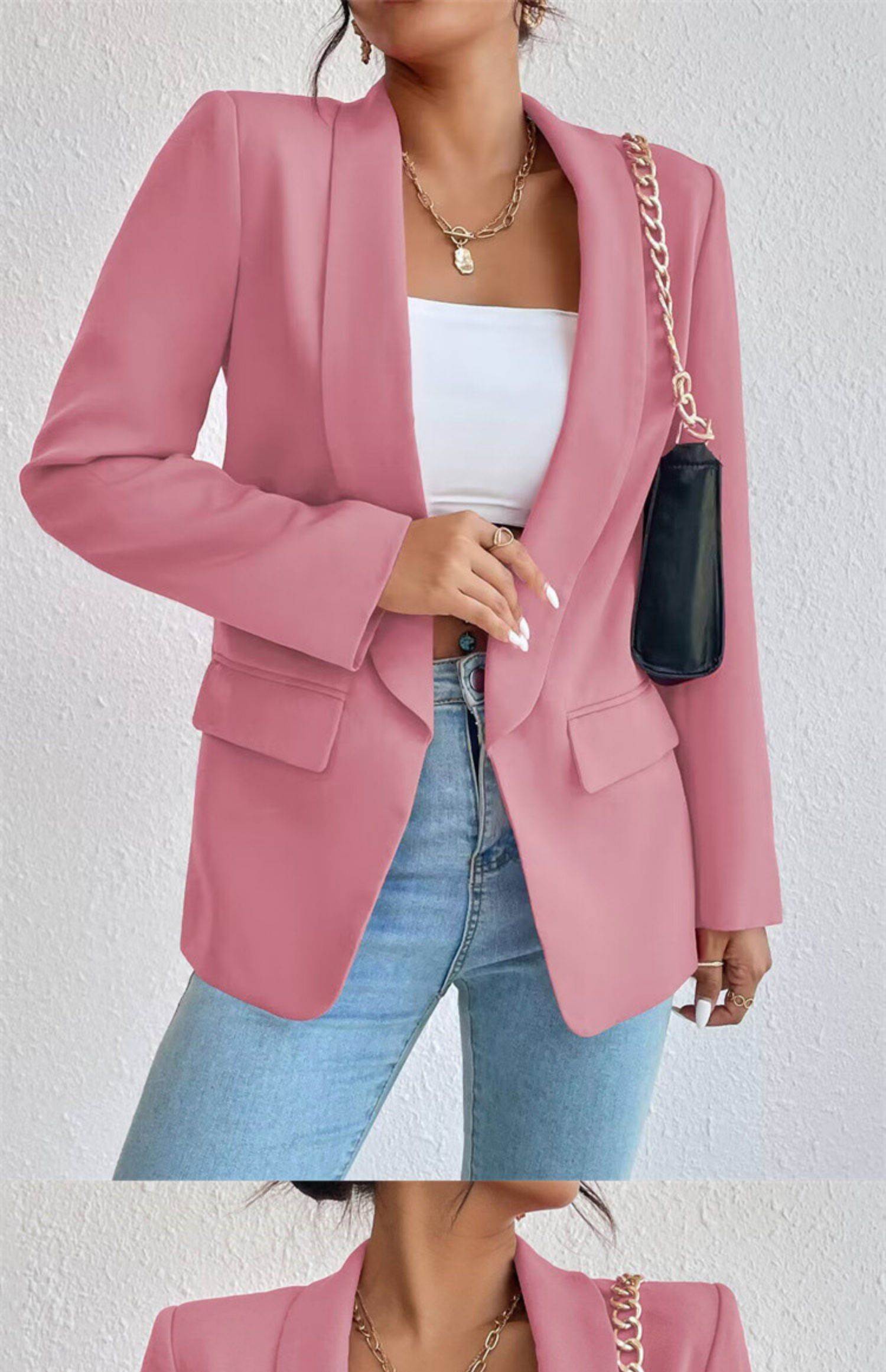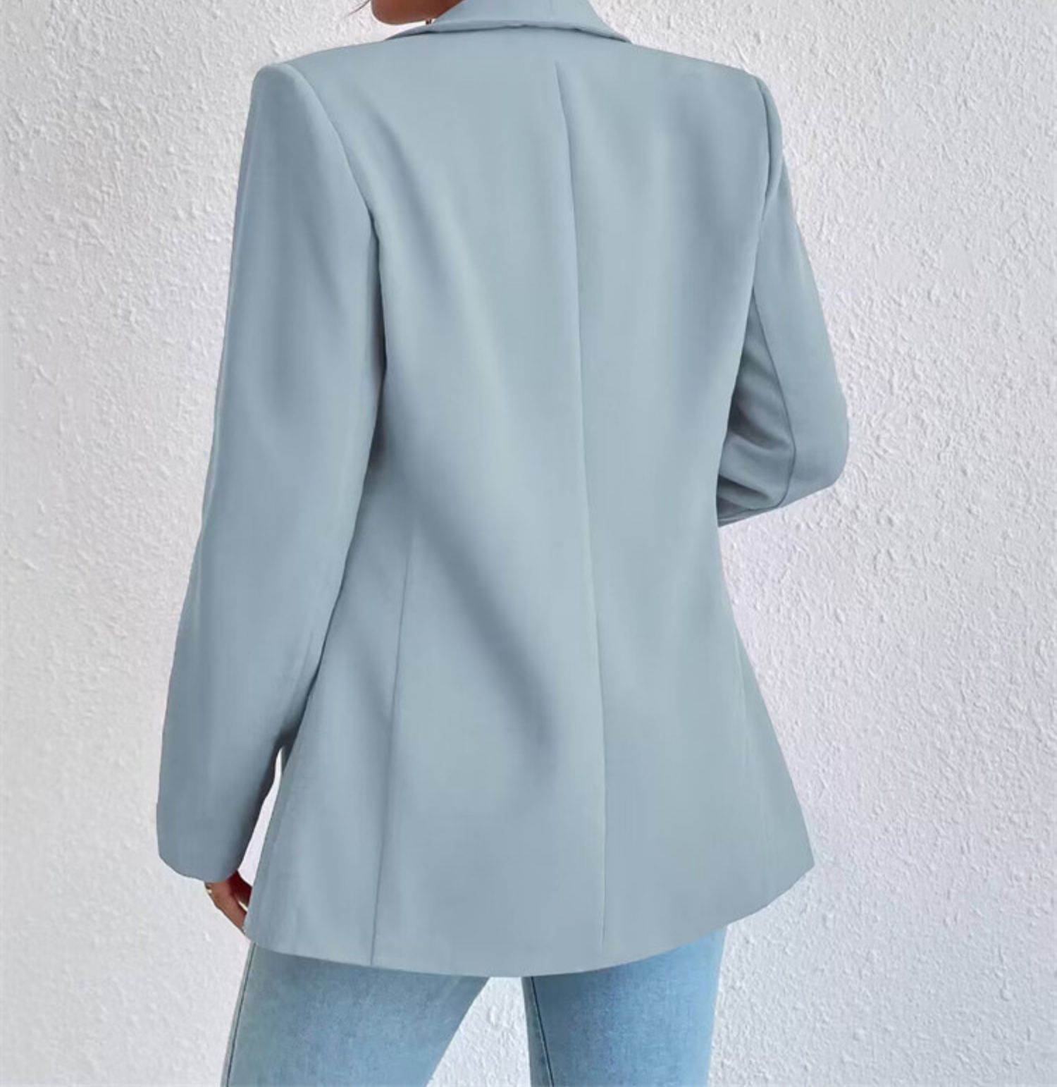 This women's blazer jacket features a classic suit collar and is crafted from polyester for durability and comfort. Designed with long sleeves and a solid color pattern, it offers a sleek street style perfect for spring. This versatile blazer is an ideal addition to your wardrobe for a polished, contemporary look.