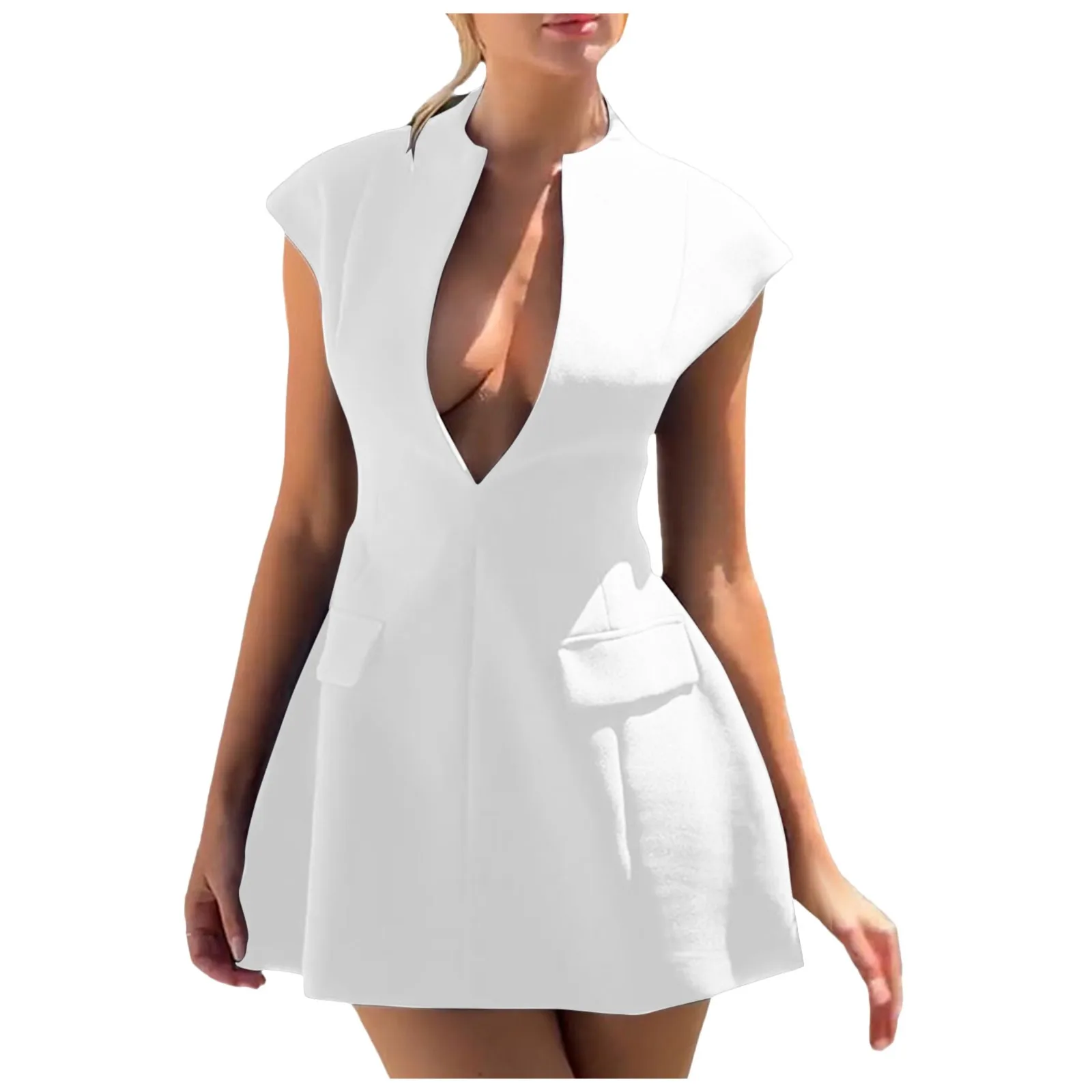Fashion Women's Casual Sexy Deep V Neck Sleeveless Suit Dress Without Pocket